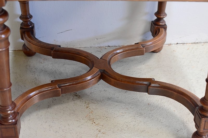 Il repose sur 4 pieds tournés, sculptés et moulurés, reliés d’une entretoise en X moulurée.