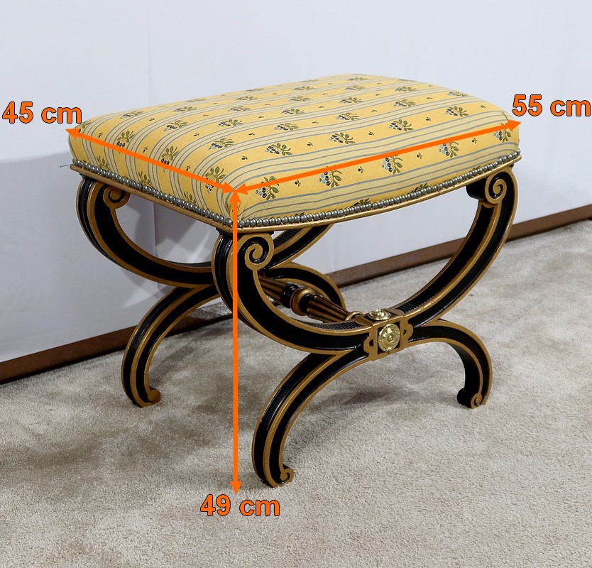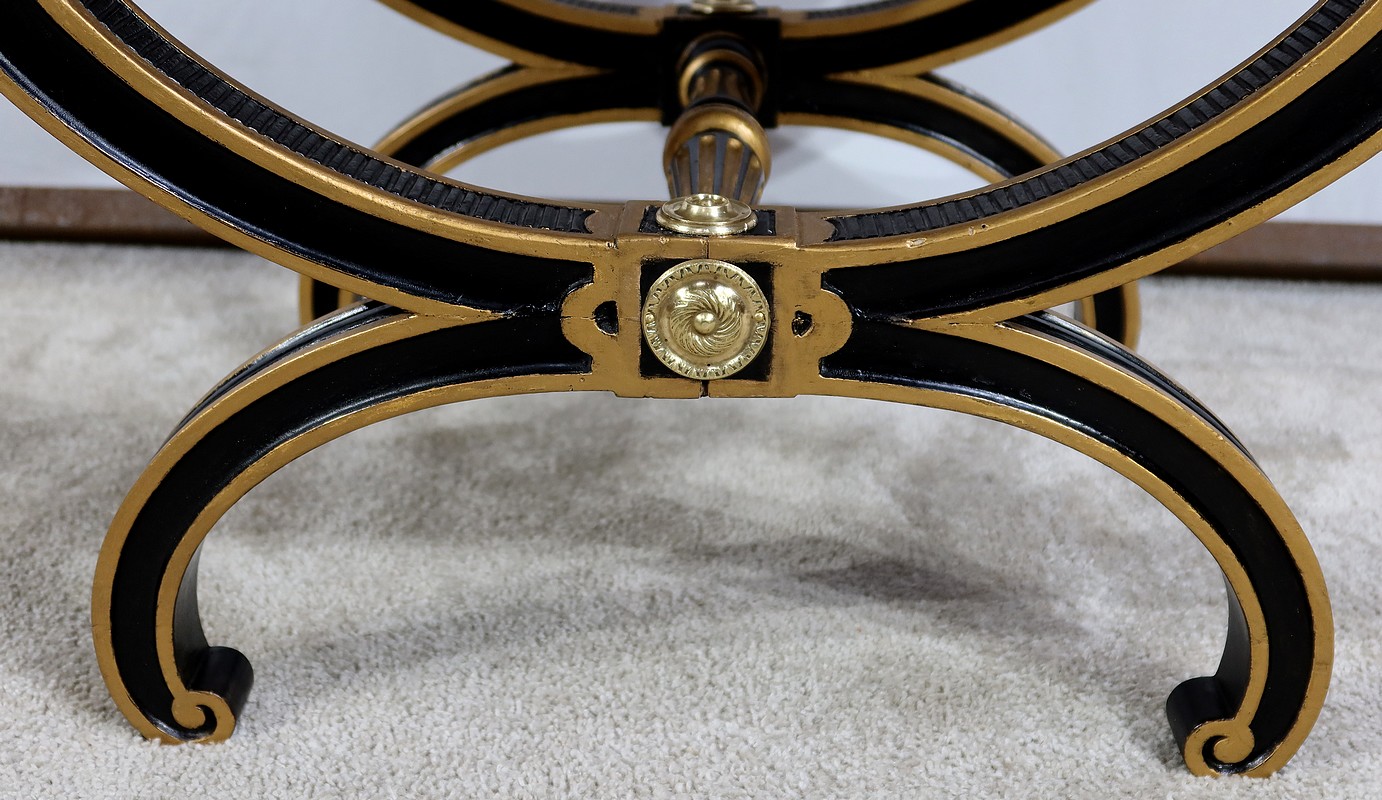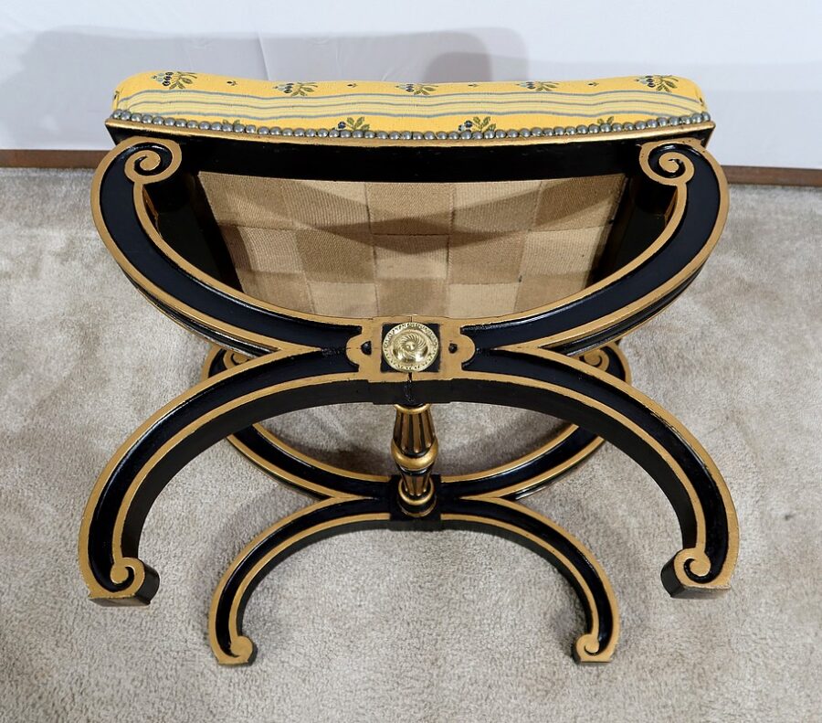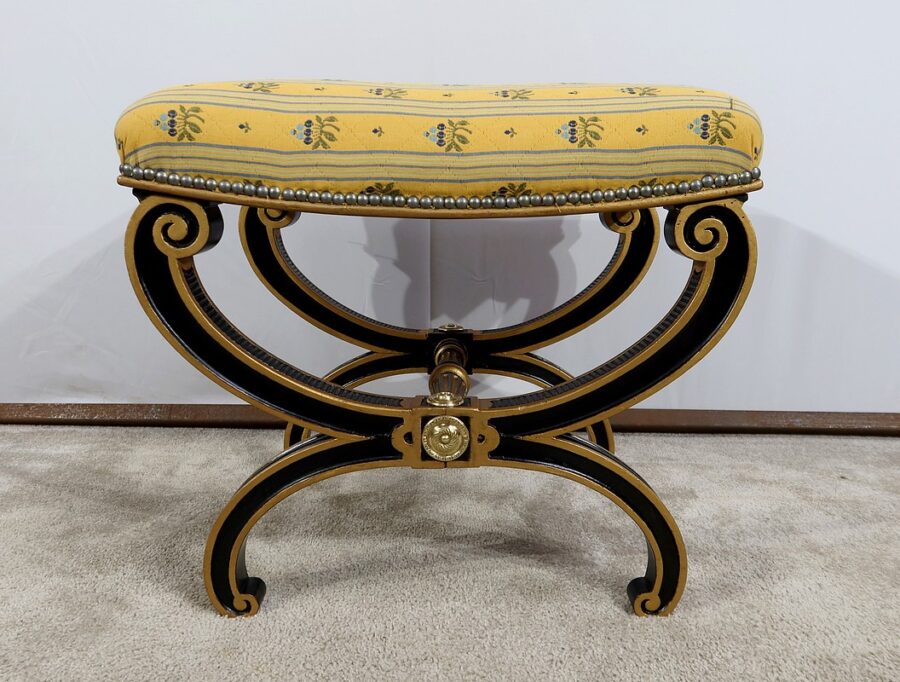 Charmant tabouret curule de style Napoléon III en bois noirci orné de dorure. Celui-ci s’inspire des meubles de l’antiquité romaine. On retrouve le piétement en X à volutes sur chacune des façades. Celles-ci sont agrémentées d’une rosace en bronze au centre et sur le dessus. La structure de ce siège stable est renforcée par une entretoise centrale sculptée de cannelures. L’assise de ce petit mobilier, solidement équerré, est traditionnelle (sangles et crin) et habillée d’un beau tissu jaune aux motifs floraux en excellent état.