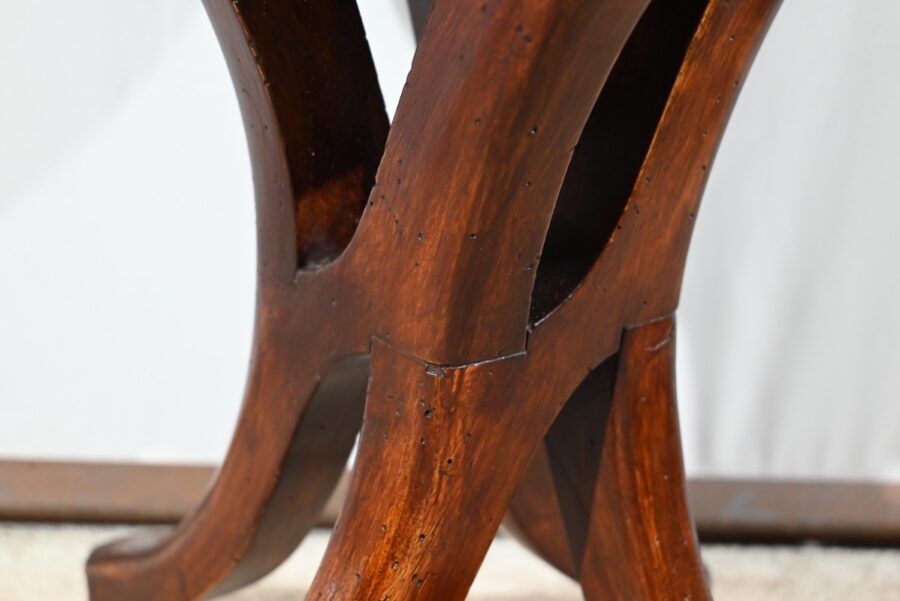Ce tabouret circulaire en hêtre teinté, réglable à l’aide d’une tige filetée, présent des pieds composés de quatre éléments mouvementés enchevêtrés les uns aux autres pour finir par des pieds biche.
