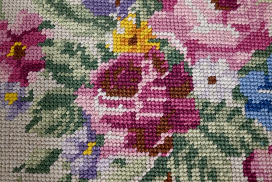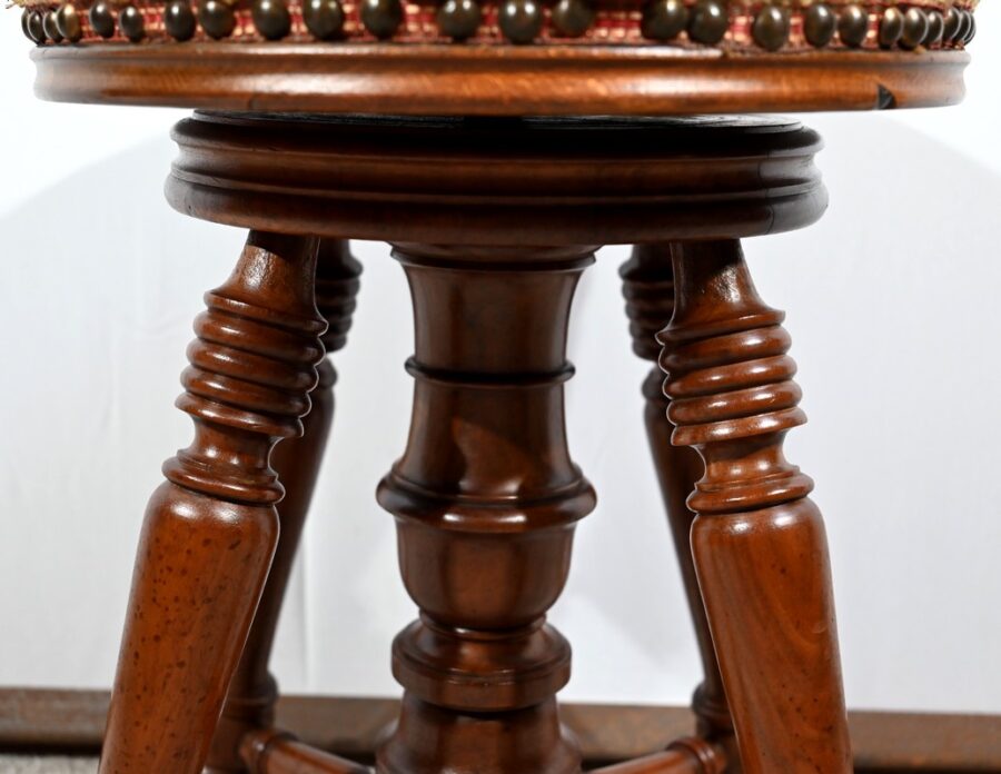 Tabouret de piano en noyer massif, réglable en hauteur, est habillé d’un canevas d’origine, clouté sur galon et en parfait état, à décors de fleurs.