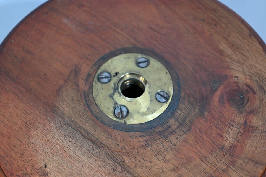 Le piétement, dans l’esprit compas, présente un important fût mouluré et quatre pieds tournés reliés entre eux par des entretoises disposés en étoile.