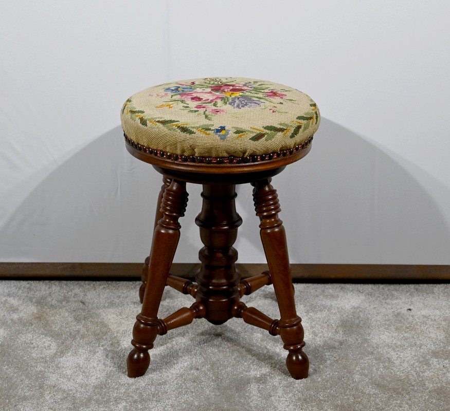 Tabouret de piano en noyer massif, réglable en hauteur, est habillé d’un canevas d’origine, clouté sur galon et en parfait état, à décors de fleurs.