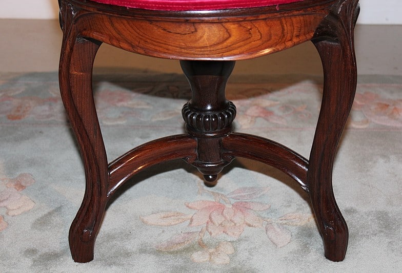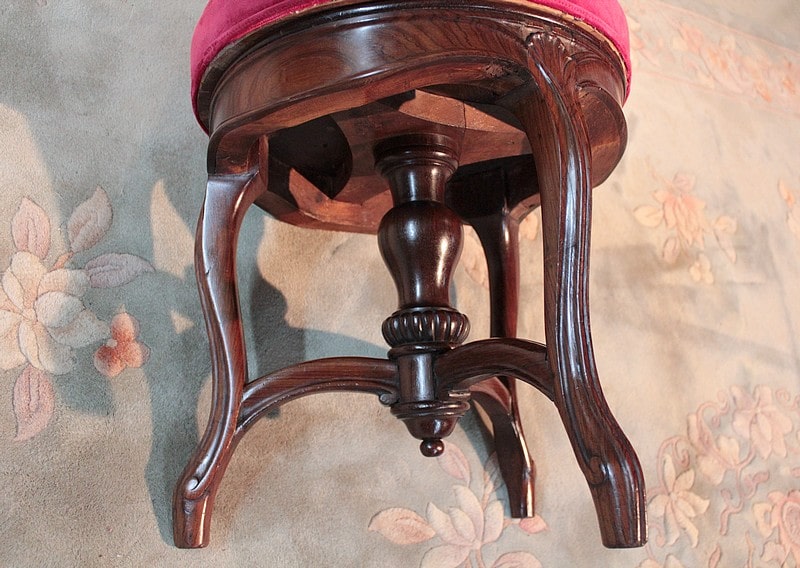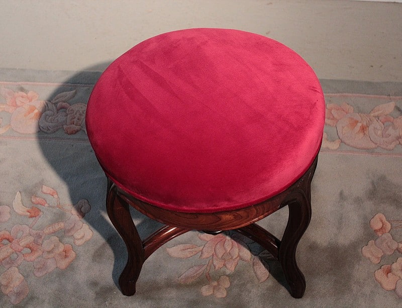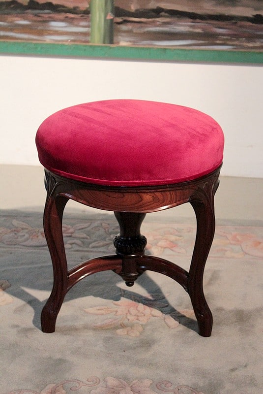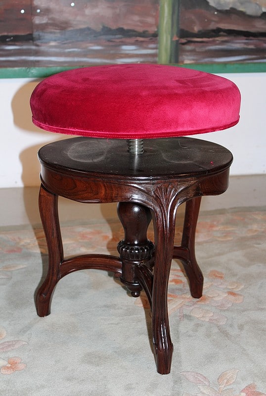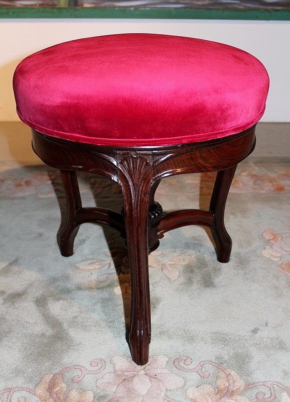 Tabouret de Piano tripode en palissandre. Assise réglable de 46cm à 55cm. Il est recouvert d’un velours rouge ‘framboise’