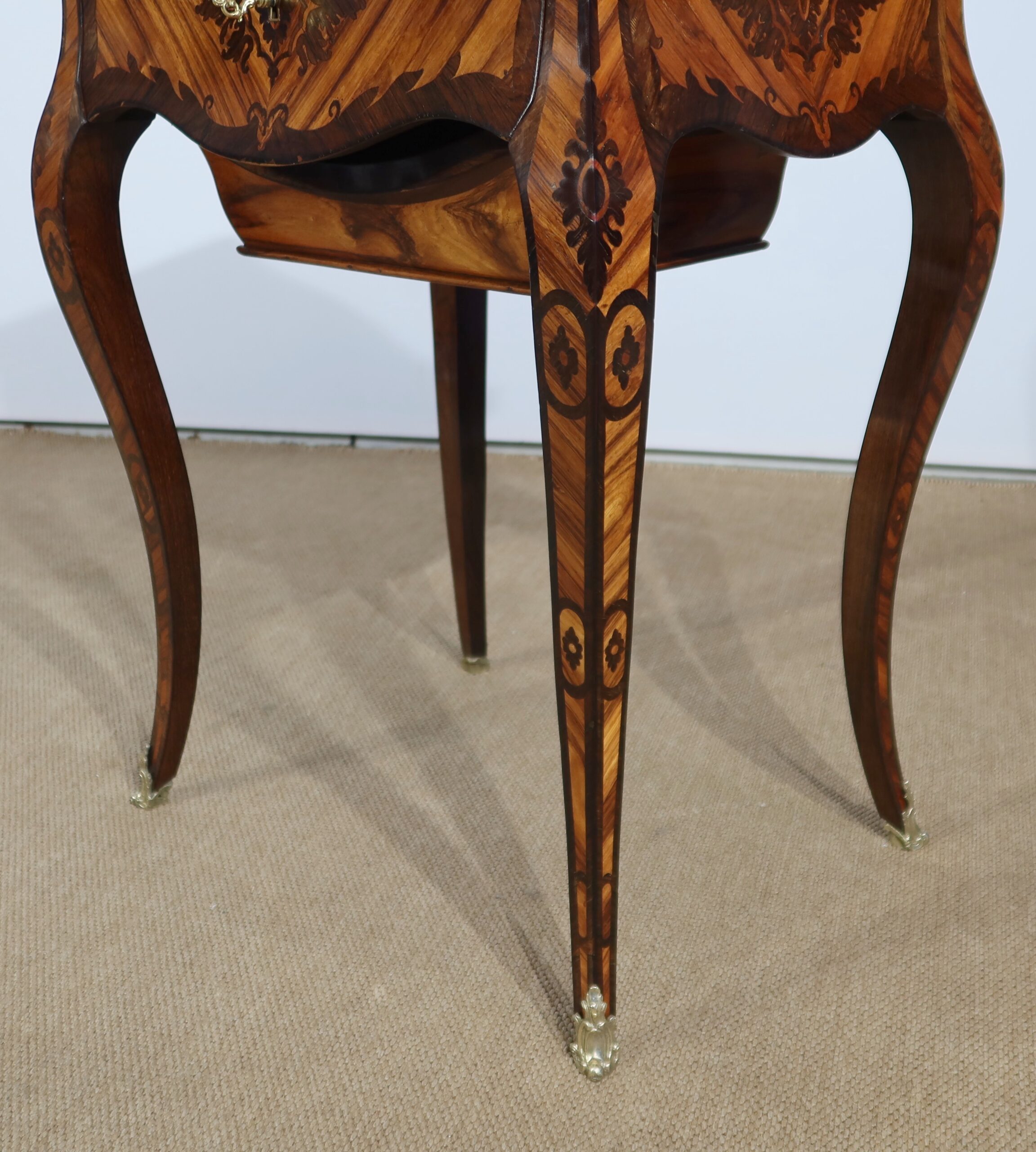 Gracieuse et astucieuse, cette travailleuse Louis XV vous séduira par sa forme unique alliant riche marqueterie et élégance.