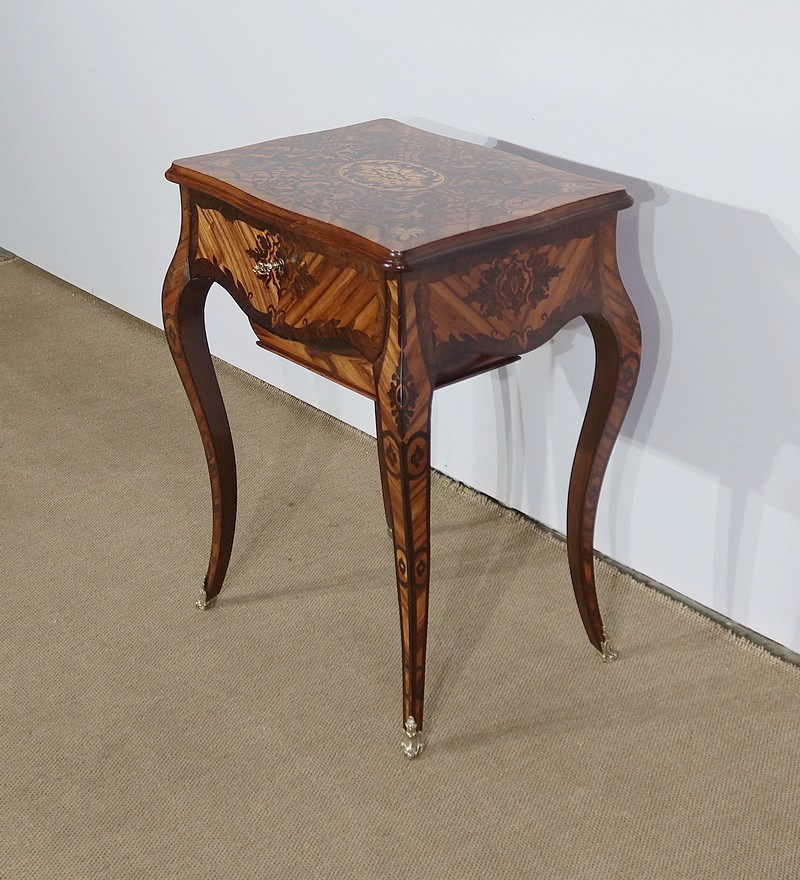 Travailleuse Louis XV en marqueterie de bois de rose et de palissandre, réalisée dans un atelier parisien au milieu du XIXe siècle.