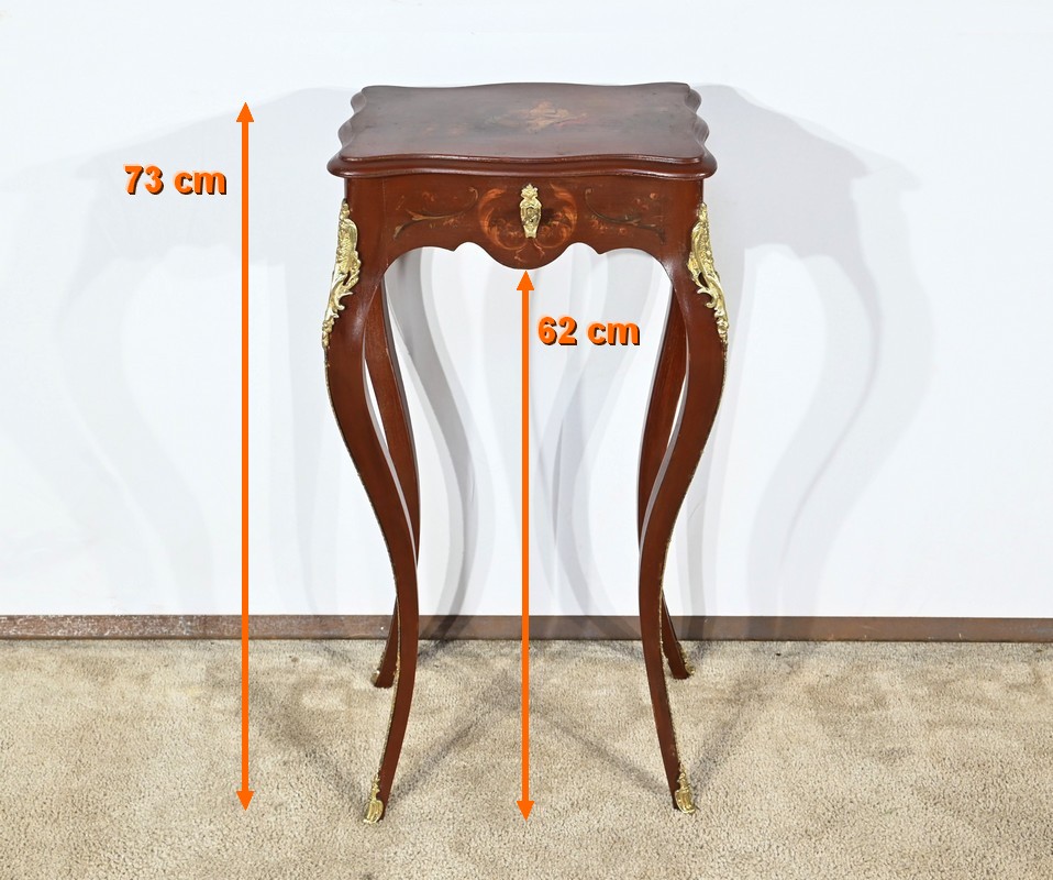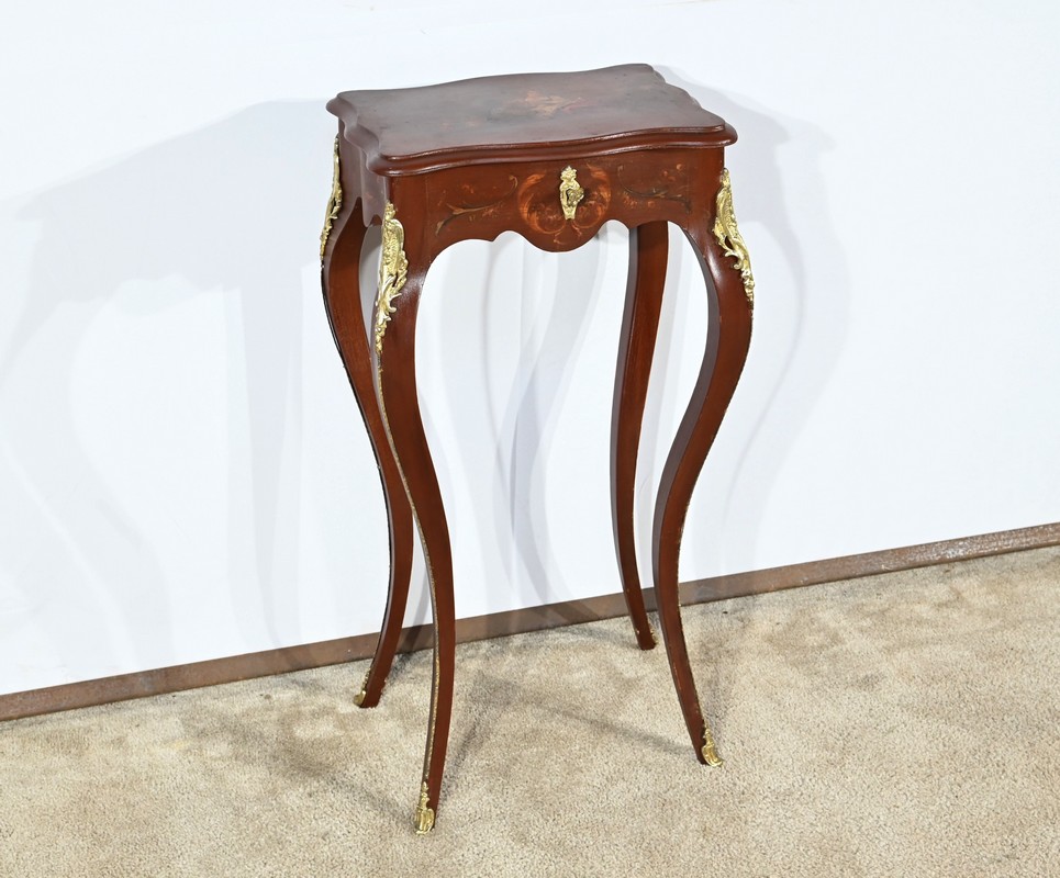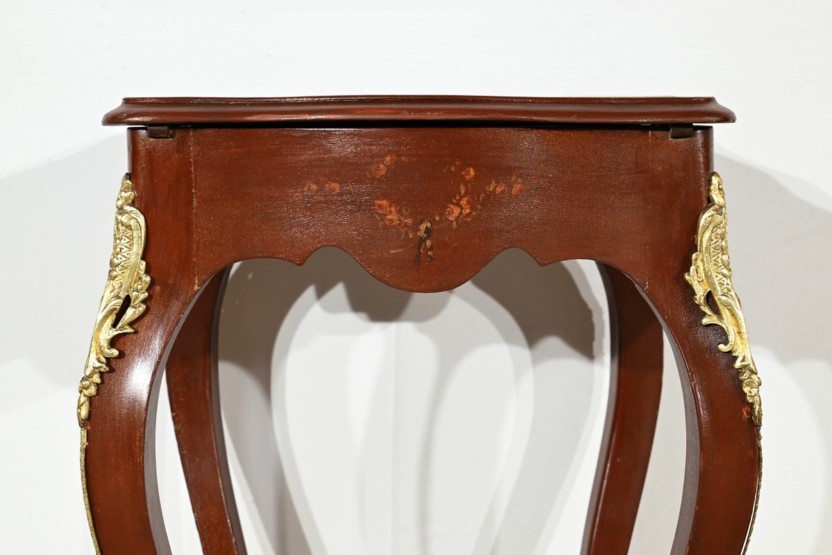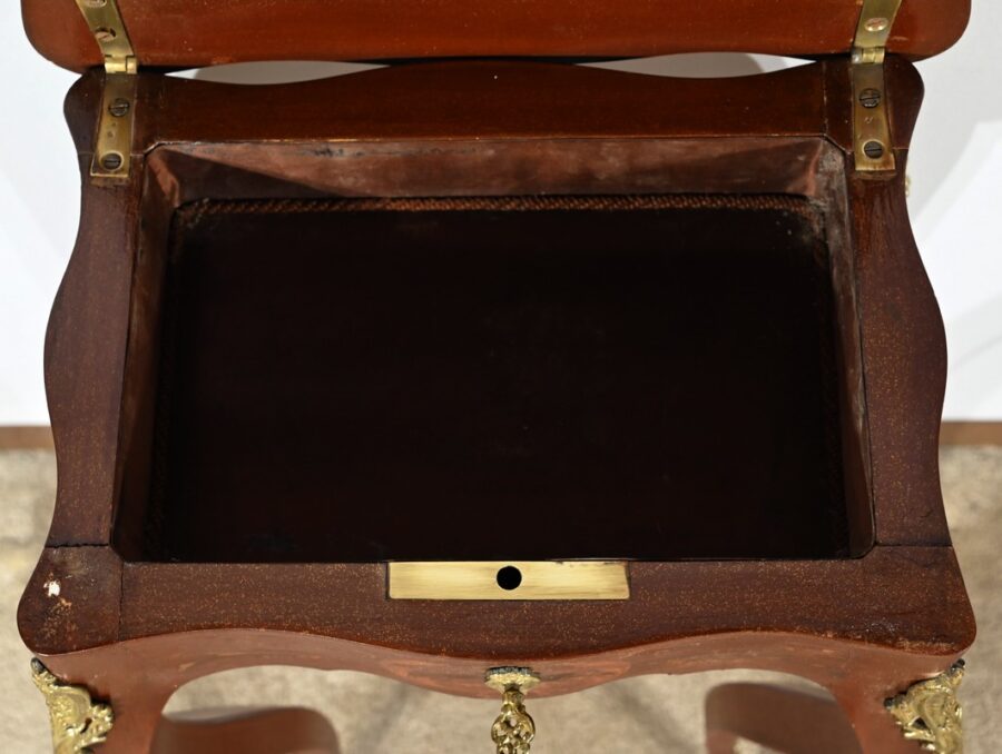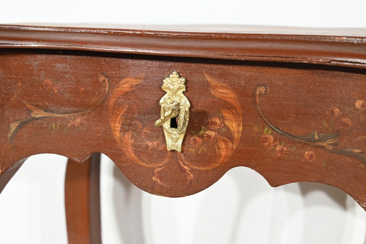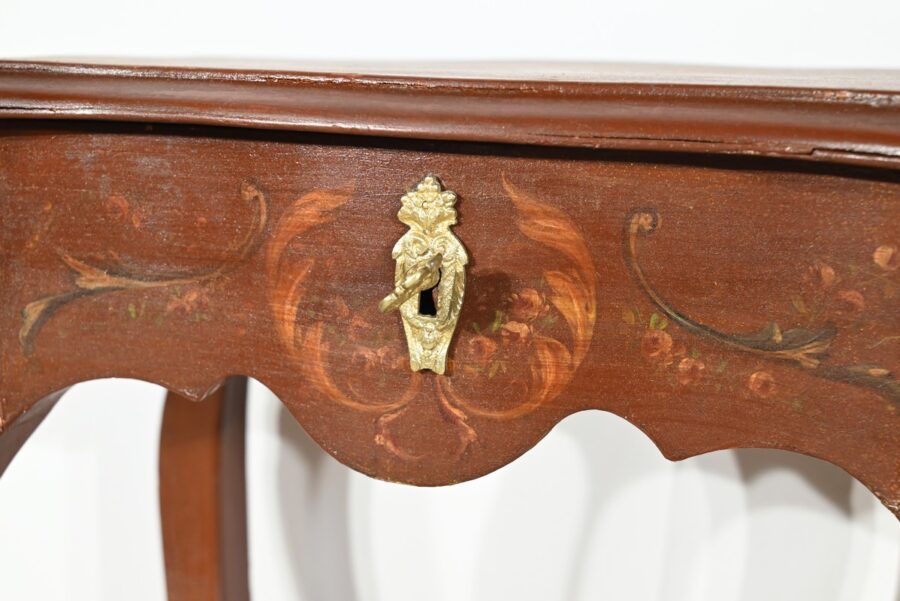 Cette table à ouvrage en bois laqué présente un couvercle mouvementé à doucine monté sur charnières et agrémenté d’une peinture polychrome d’un après-midi galant dans les jardins d’un château.