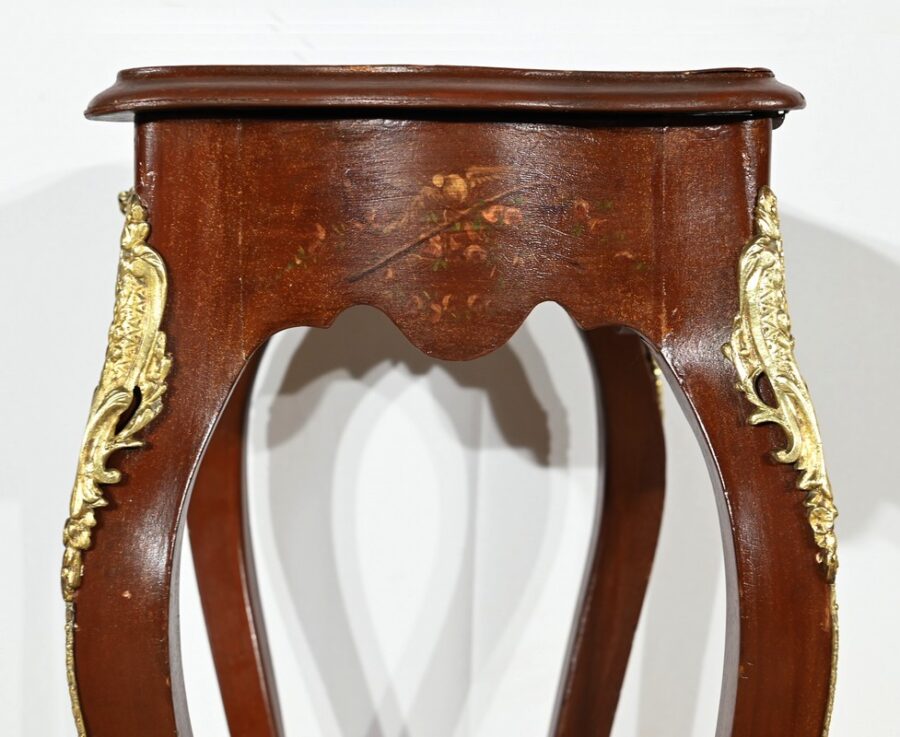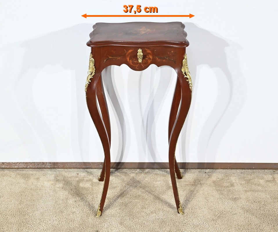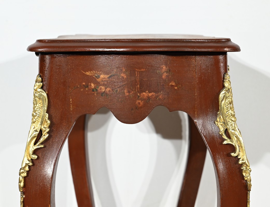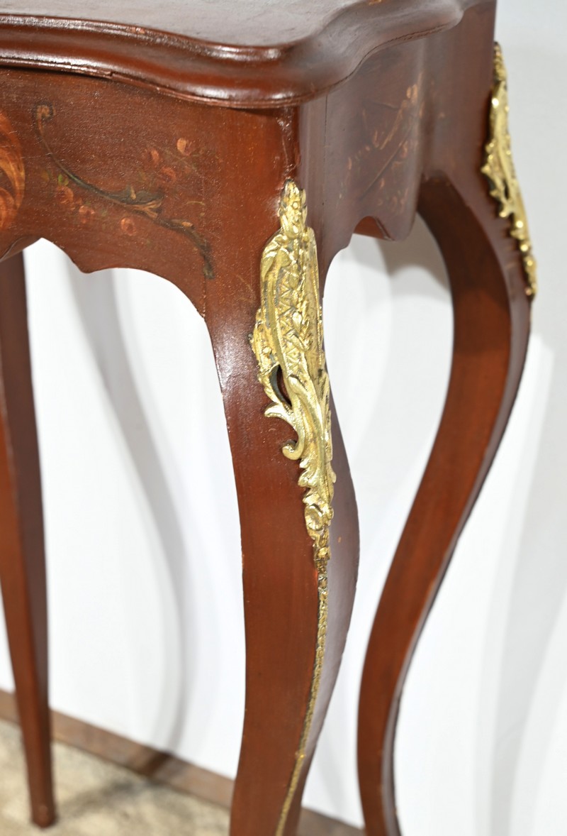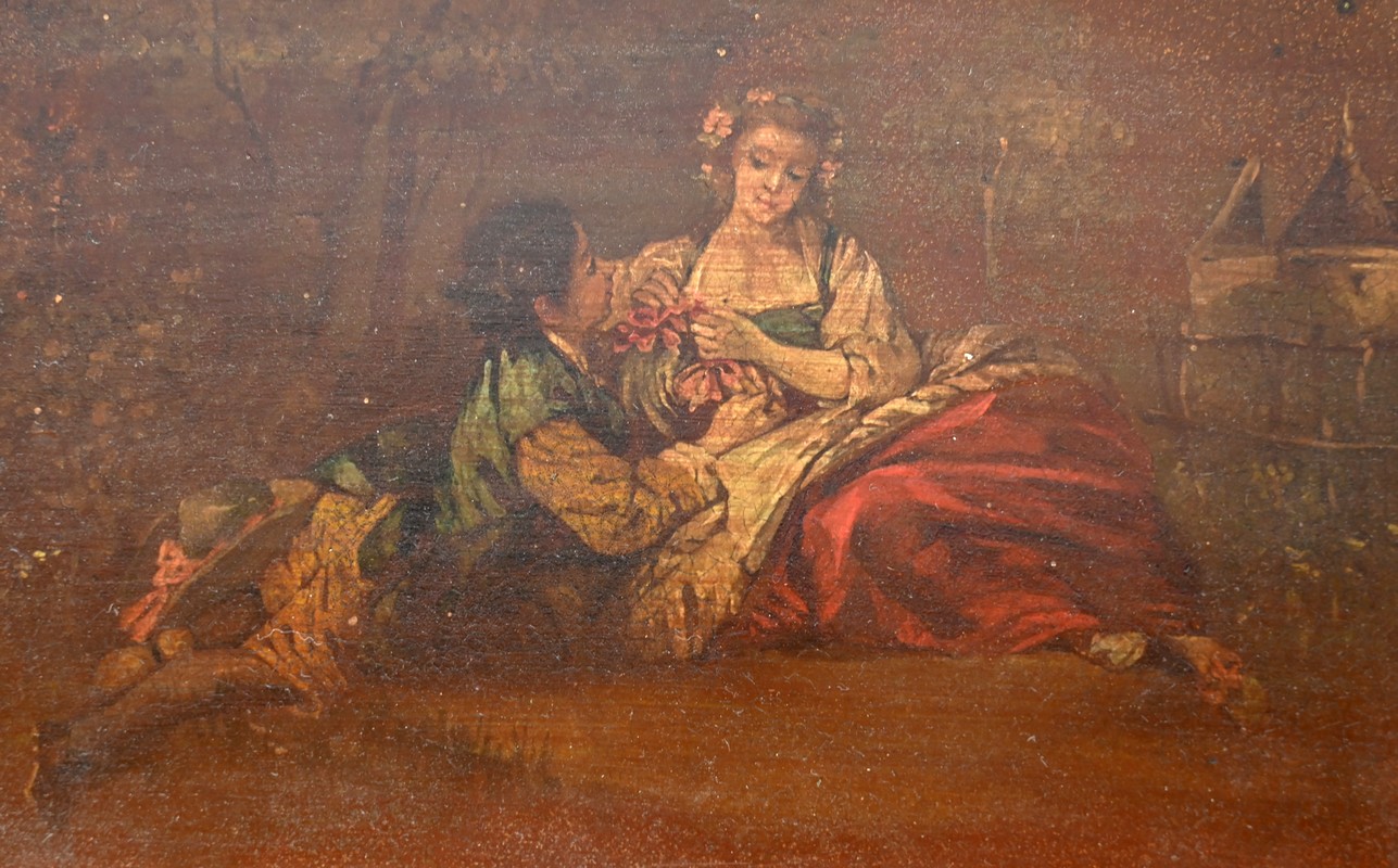 Cette table à ouvrage en bois laqué présente un couvercle mouvementé à doucine monté sur charnières et agrémenté d’une peinture polychrome d’un après-midi galant dans les jardins d’un château.