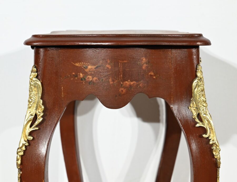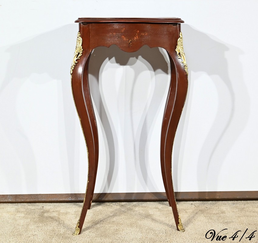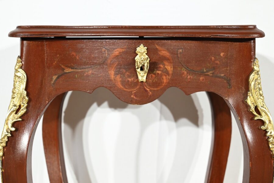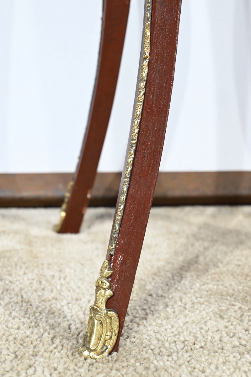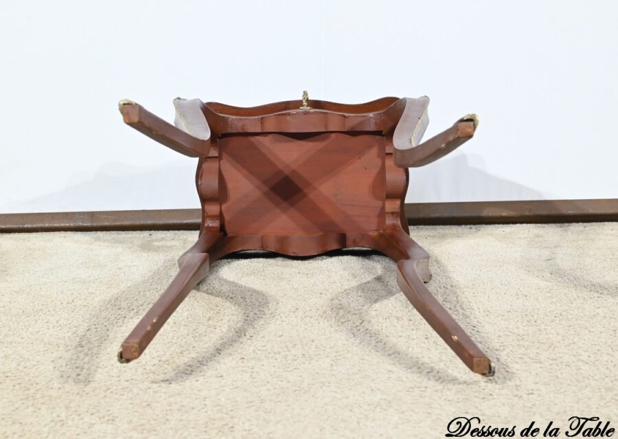 L’ensemble repose sur quatre pieds dits « en coup de fouet » et sont habillés de chutes de feuilles d’acanthe se profilant aux arêtes en de fines moulures en bronze se terminant par de petits sabots.