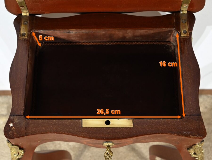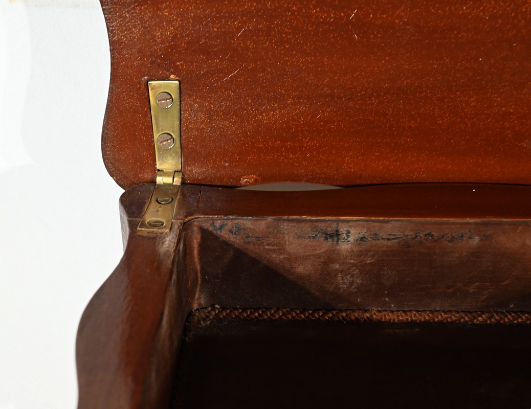Ce couvercle, permettant l’accès à un petit espace de rangement, se verrouille à l’aide d’une serrure d’origine fonctionnelle avec entrée végétale accompagnée de sa clé.