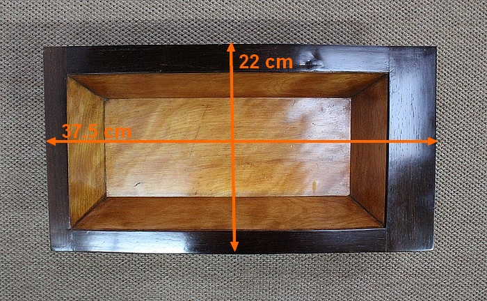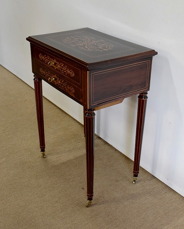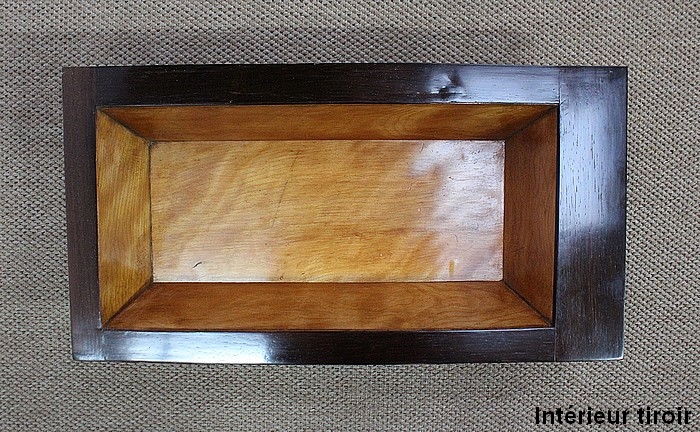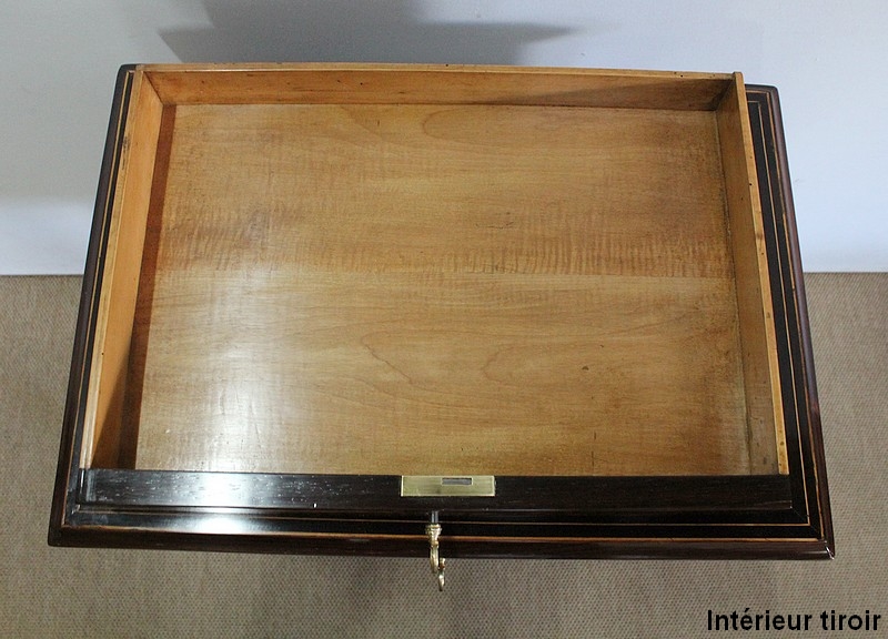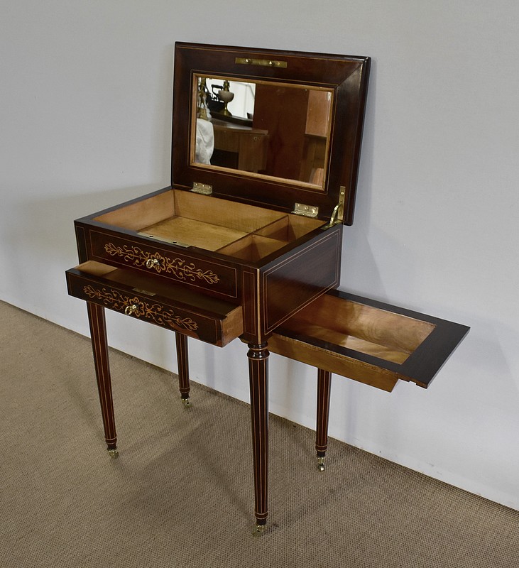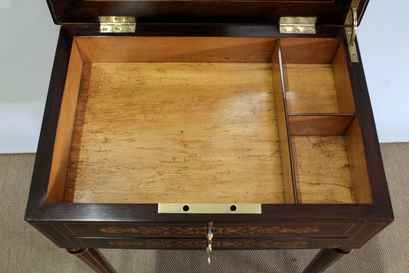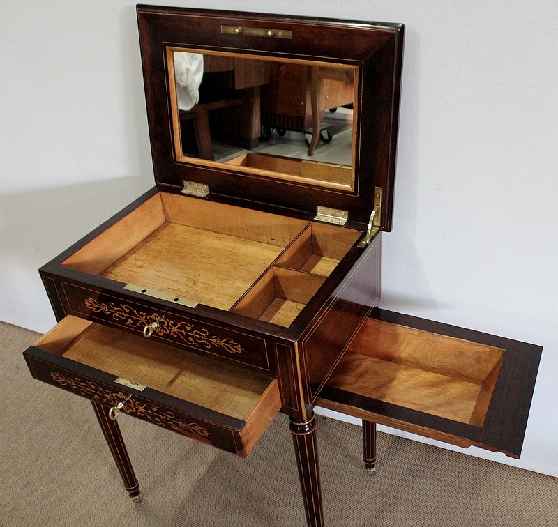 Le couvercle s’ouvre, retenu en partie droite par un compas en laiton. En son centre, un miroir rectangulaire est entouré par une baguette en citronnier suivi d’un encadrement en palissandre à coupe d’onglet avec filet de citronnier. La partie intérieure de cette travailleuse possède un grand casier en bois clair accompagné de deux plus petits identiques. L’abattant se ferme par une serrure d’origine en parfait état de fonctionnement accompagnée de sa clé.