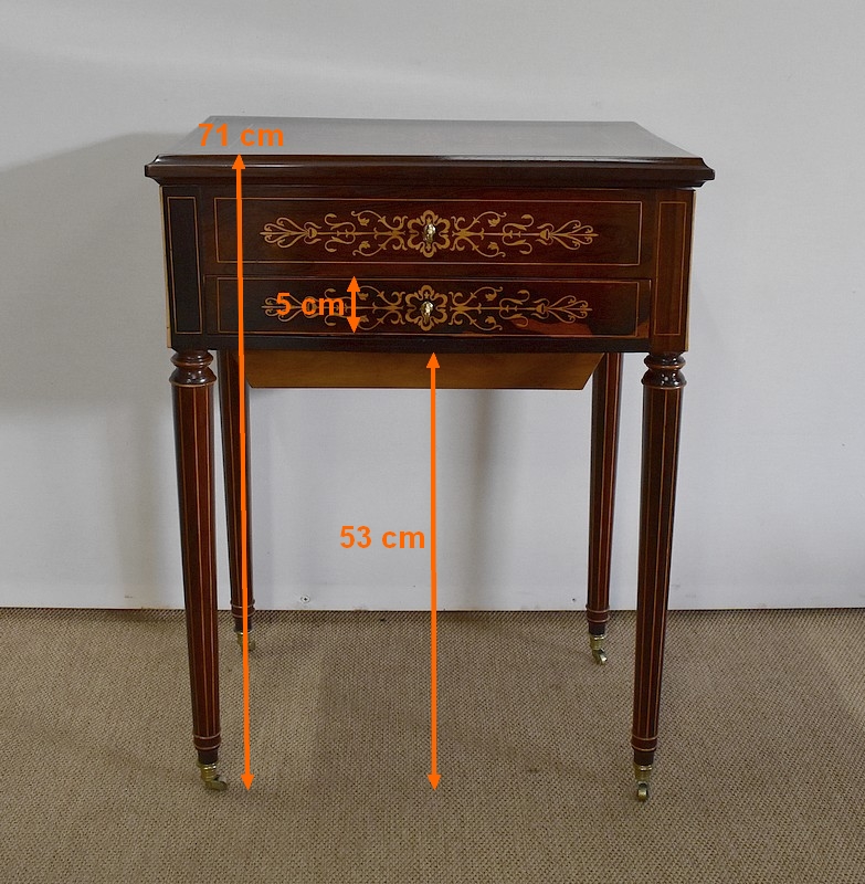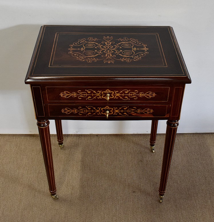 Magnifique table travailleuse pourvue d’un dessus en placage de palissandre de Rio et d’une moulure à gorge dans son pourtour. Allant vers l’intérieur, deux filets en citronnier encadrent une bande de palissandre à coupe d’onglet. Au centre, on trouve un panneau composé d’un enchevêtrement de volutes, de feuillages et de fleurs.