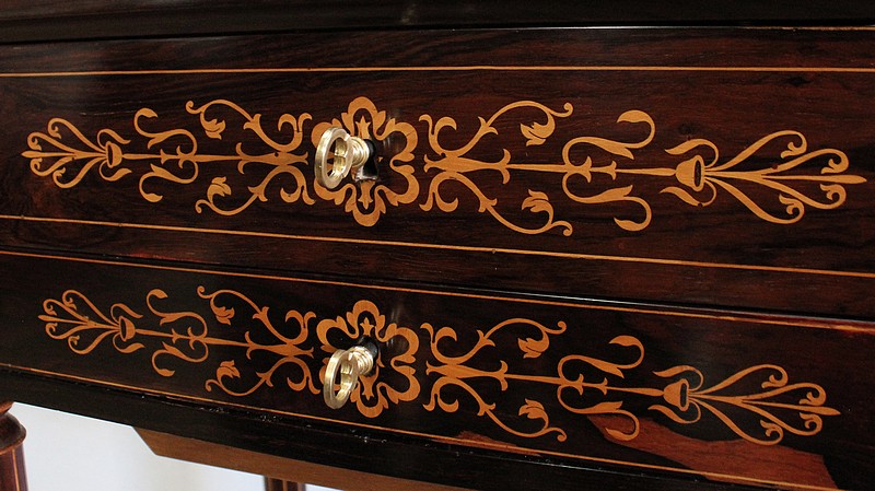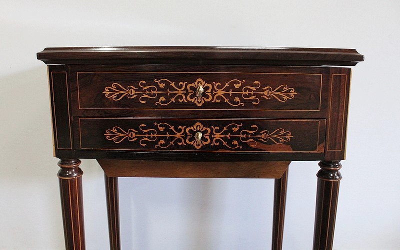 La façade de ce mobilier unique est décorée d’incrustations sur palissandre reprenant les motifs du dessus. La ceinture de cette travailleuse est munie d’un tiroir composé de citronnier. En partie droite du corps, nous retrouvons un tiroir se tirant en forme de trémie avec dessus en palissandre.
