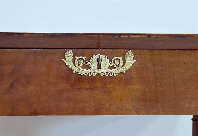 Elle ouvre par un abattant fermant à clef dont l’entrée de serrure est ornée d’un bronze décoratif représentant des cornes d’abondances et une couronne de lauriers.