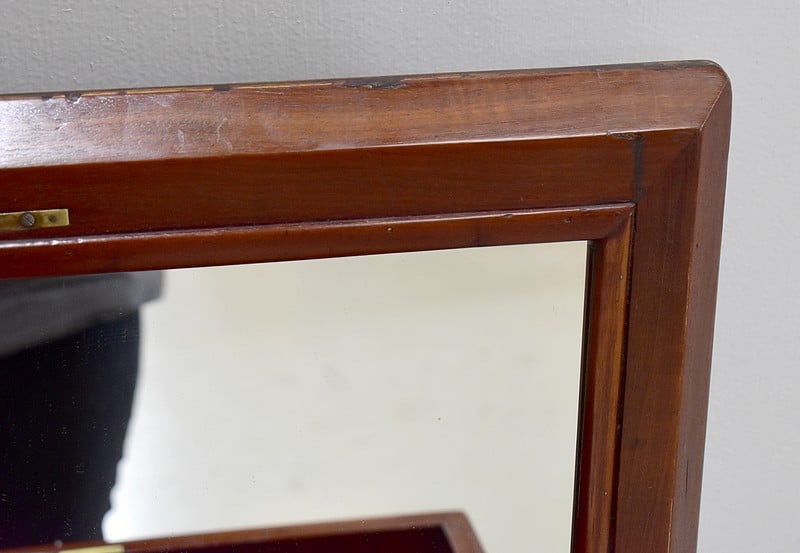 L’intérieur de l’abattant est agrémenté d’une glace encadrée occupant toute la surface et doté d’un compas d’arrêt.