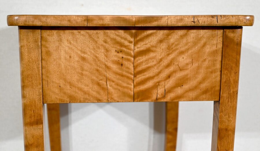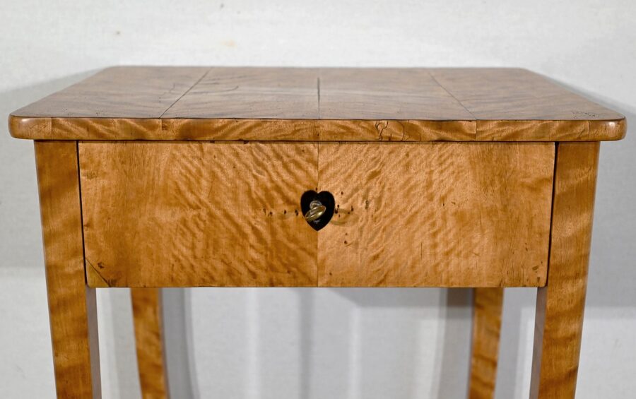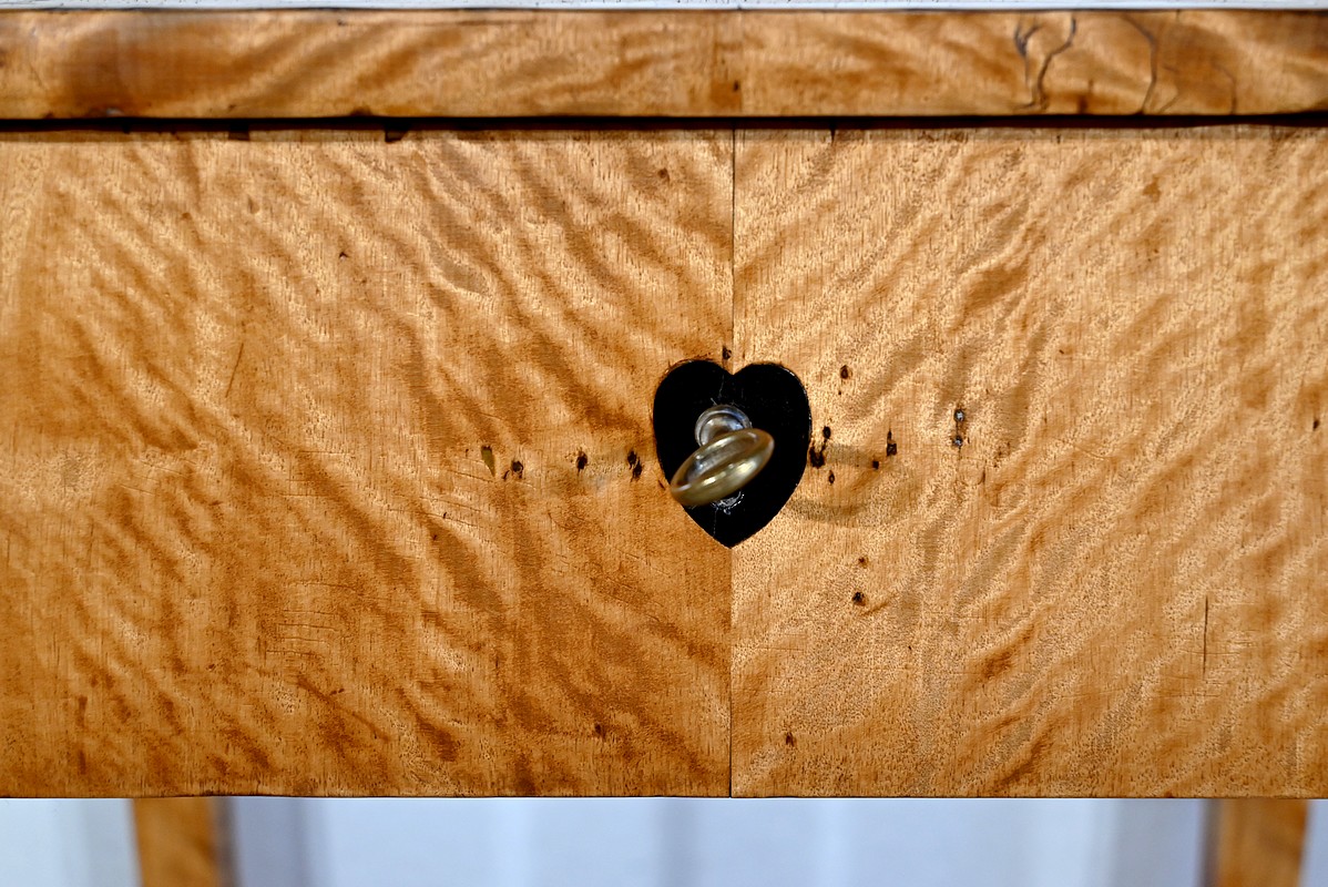 On retrouve en façade un tiroir en placage vertical, équipé d’une serrure d’origine avec sa clé et entrée en palissandre incrustée.
