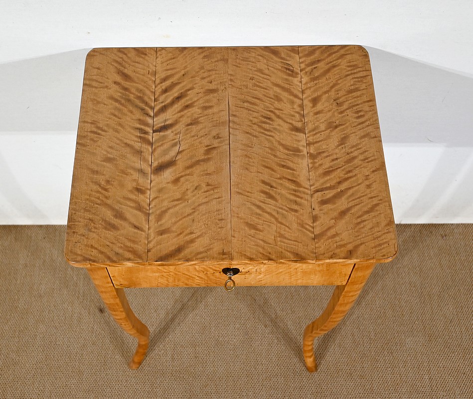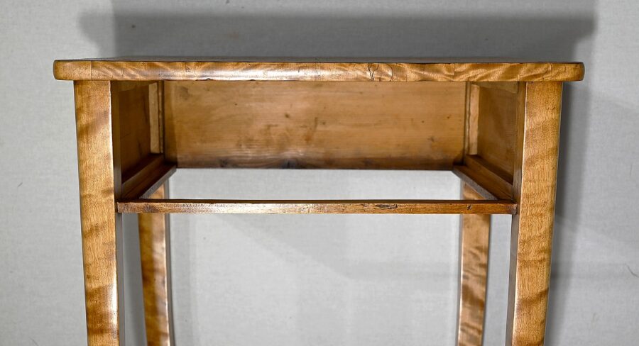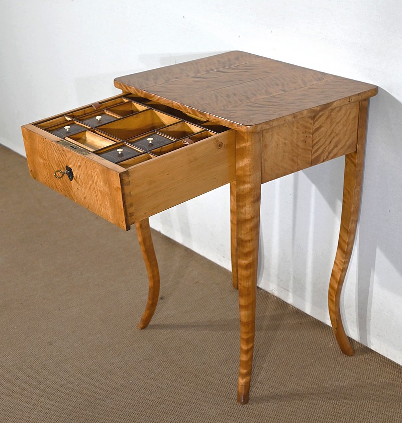 Travailleuse en placage de bois clair de Ceylan dont le plateau est composé de quatre frises symétriques.