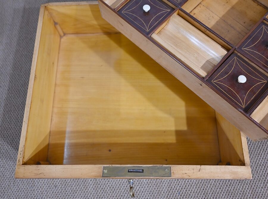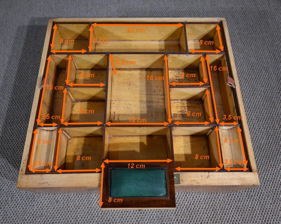 L’intérieur, en citronnier, offre quinze compartiments, dont quatre sont fermés par des couvercles en acajou, avec incrustations de citronnier et boutons en os. Le logement frontal se bascule, révélant un coussin à aiguilles.