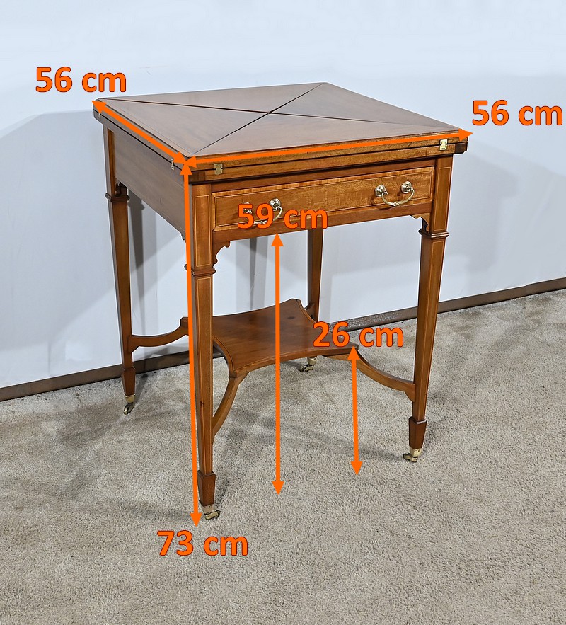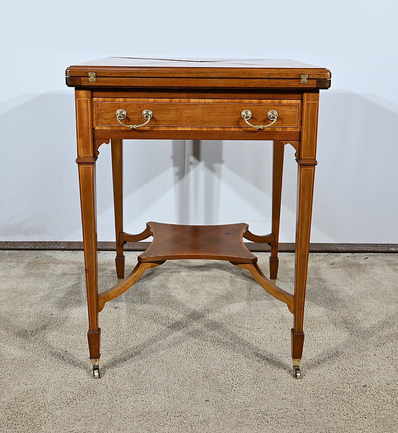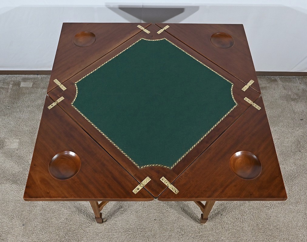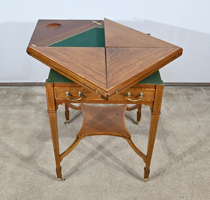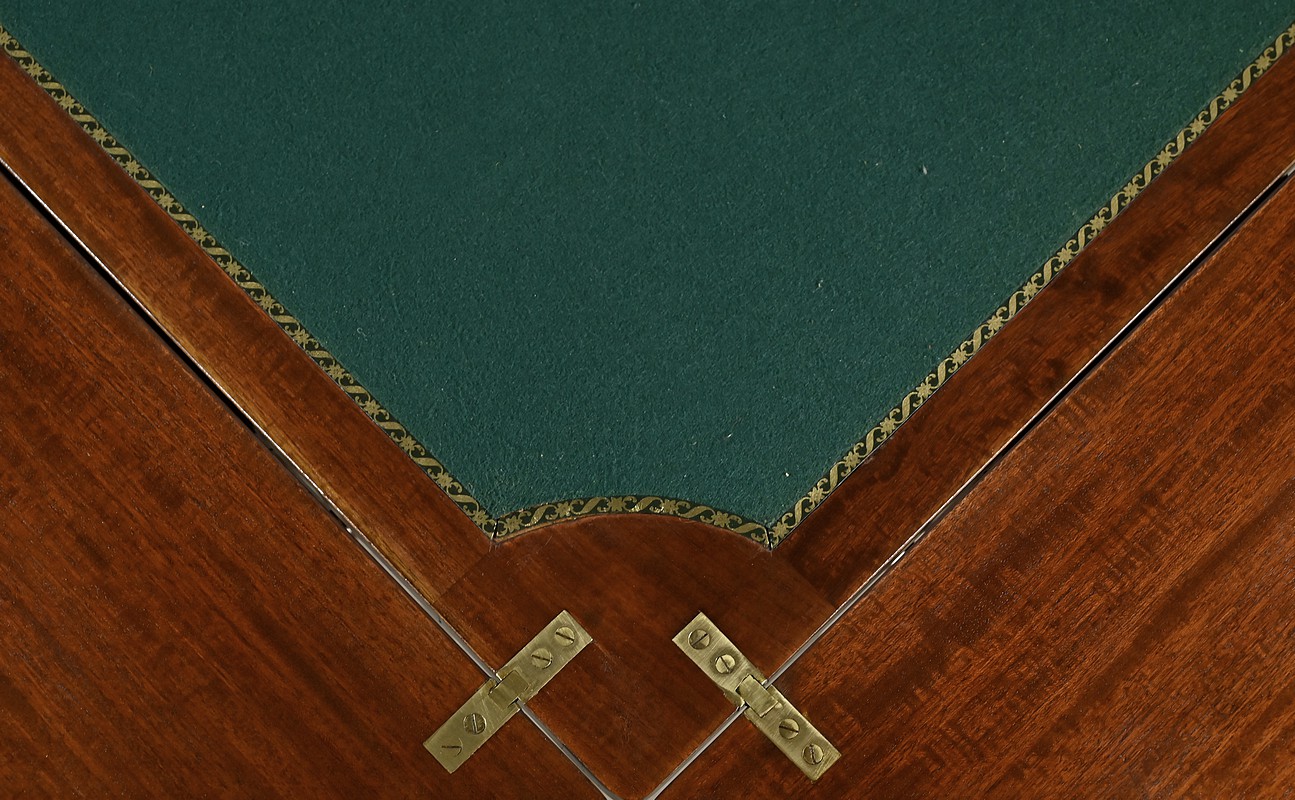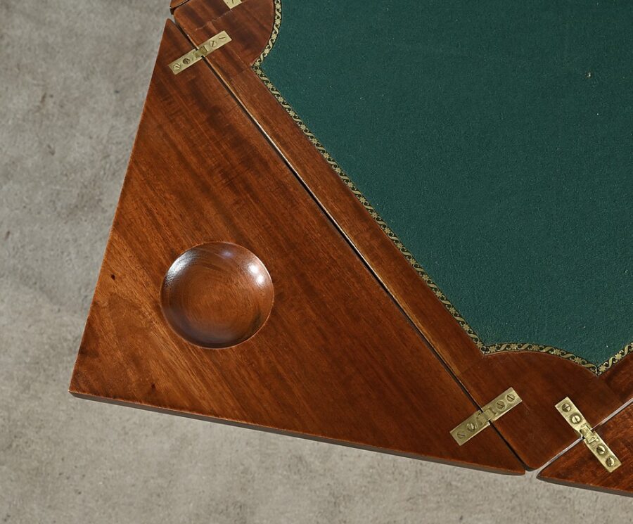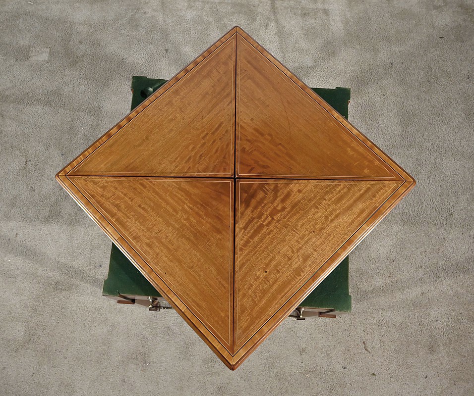 En ceinture, nous retrouvons un tiroir incrusté d’un filet de citronnier et d’ébène entouré de bois de rose. Deux élégantes poignées tombantes d’origine permettent l’ouverture. Cette table repose sur quatre pieds en gaine incrustés de filets de citronnier qui se terminent par des sabots et des roulettes. En partie basse, ce petit meuble possède une tablette d’entretoise en surélévation et en retrait, réunissant les pieds. Le dessus de cette table est formé de quatre triangles incrustés de petits filets de citronnier et bordés de bois de rose. Le pourtour est mouluré avec doucine. En pivotant le plateau légèrement, l’extrémité d’un triangle se soulève grâce à un tourillon, permettant l’ouverture de la table. Celle-ci se fait sur charnières en laiton incrusté et apparentes de l’intérieur. Dans chacun des quatre éléments nous retrouvons une cavité circulaire pour poser des pions. La partie centrale est habillée d’une feutrine verte avec galon.