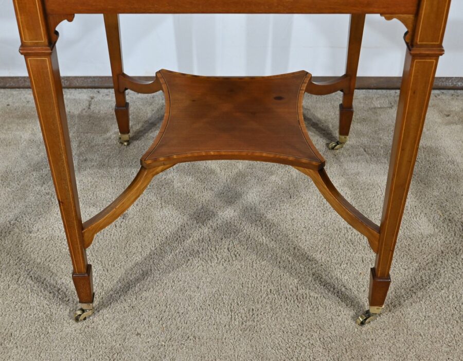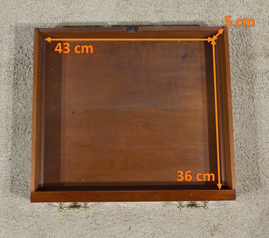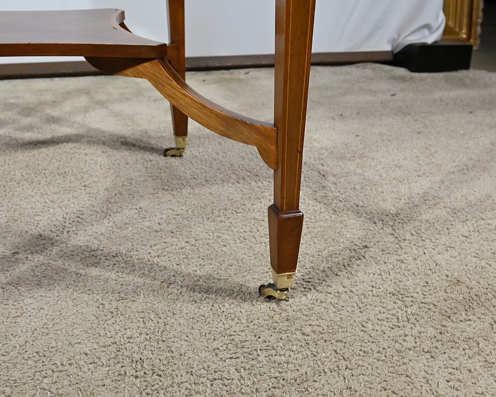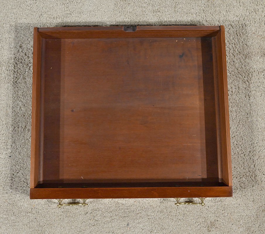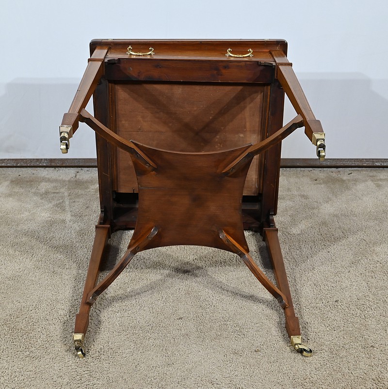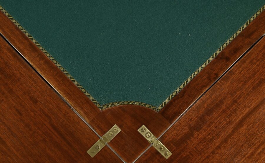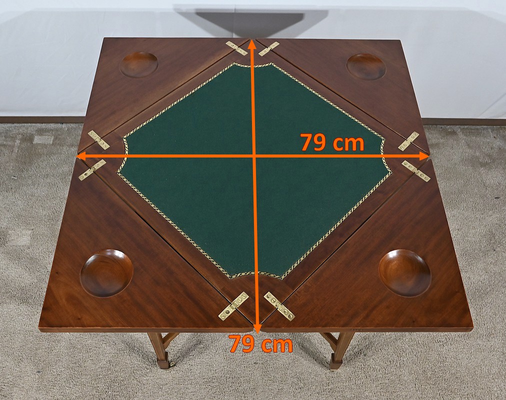 En ceinture, nous retrouvons un tiroir incrusté d’un filet de citronnier et d’ébène entouré de bois de rose. Deux élégantes poignées tombantes d’origine permettent l’ouverture. Cette table repose sur quatre pieds en gaine incrustés de filets de citronnier qui se terminent par des sabots et des roulettes. En partie basse, ce petit meuble possède une tablette d’entretoise en surélévation et en retrait, réunissant les pieds. Le dessus de cette table est formé de quatre triangles incrustés de petits filets de citronnier et bordés de bois de rose. Le pourtour est mouluré avec doucine. En pivotant le plateau légèrement, l’extrémité d’un triangle se soulève grâce à un tourillon, permettant l’ouverture de la table. Celle-ci se fait sur charnières en laiton incrusté et apparentes de l’intérieur. Dans chacun des quatre éléments nous retrouvons une cavité circulaire pour poser des pions. La partie centrale est habillée d’une feutrine verte avec galon.