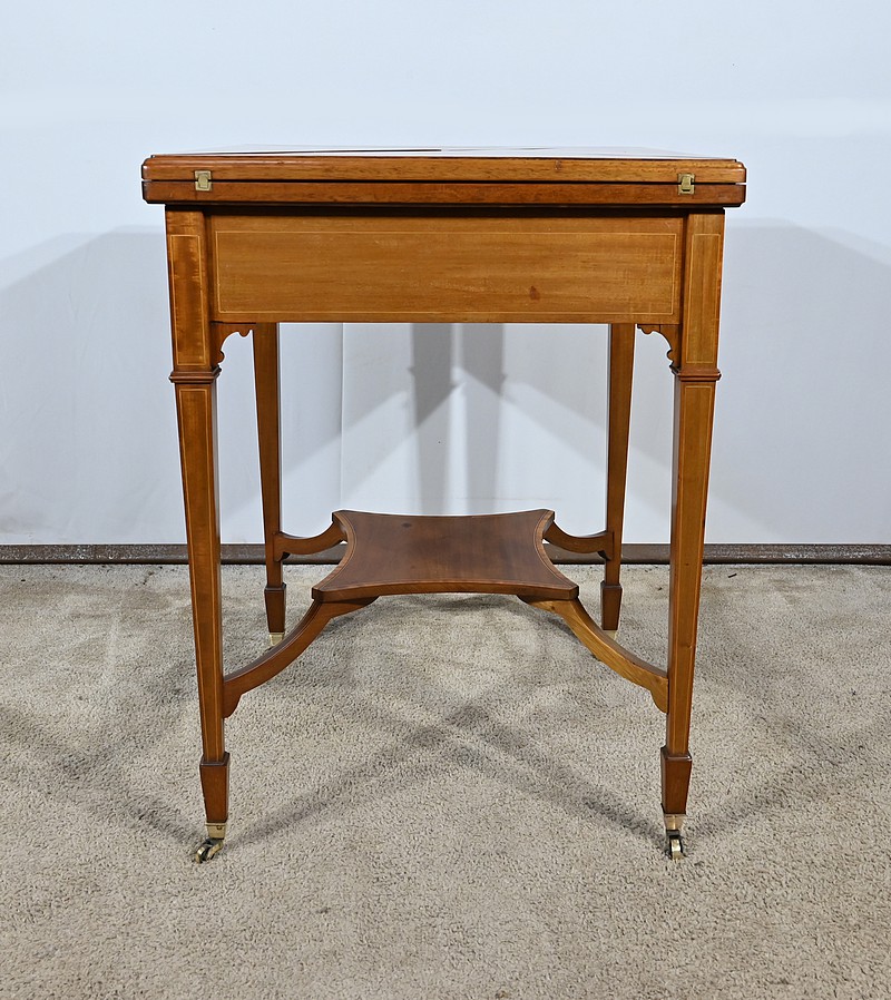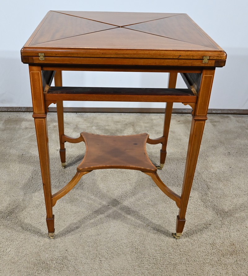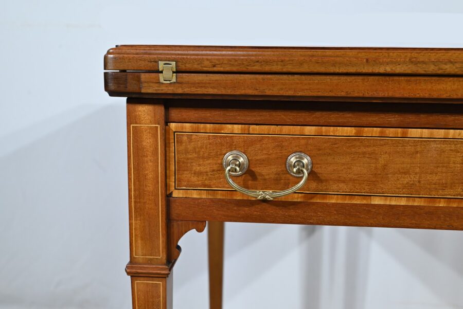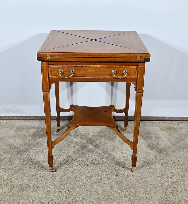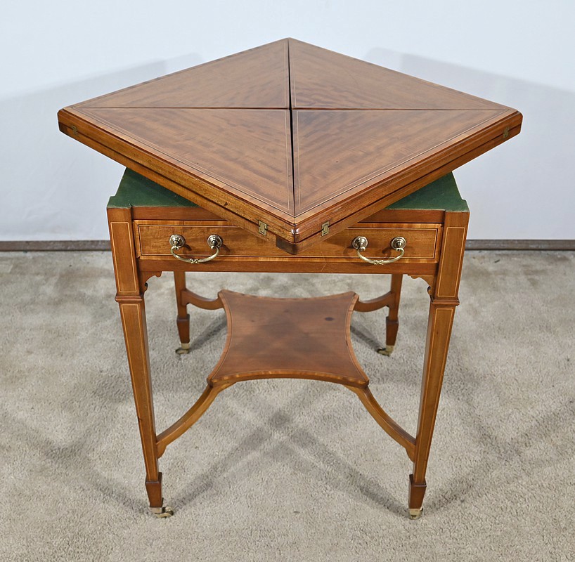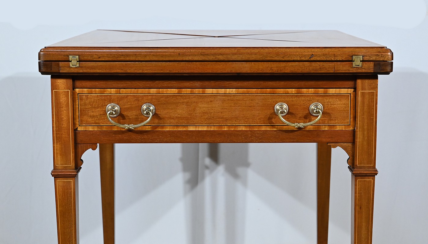 Belle table en acajou massif ornée d’incrustations de bois de rose avec plateau mouchoir se transformant en table à jeux.