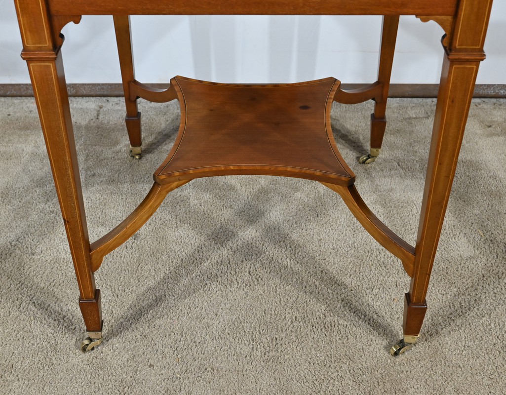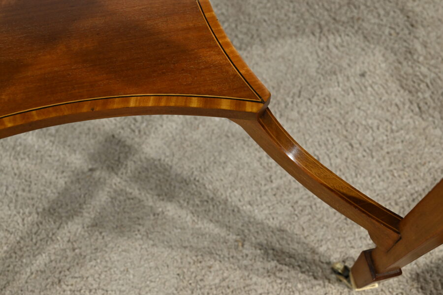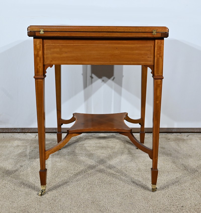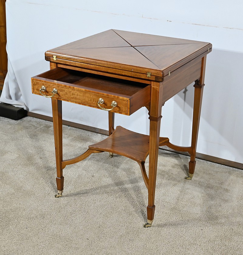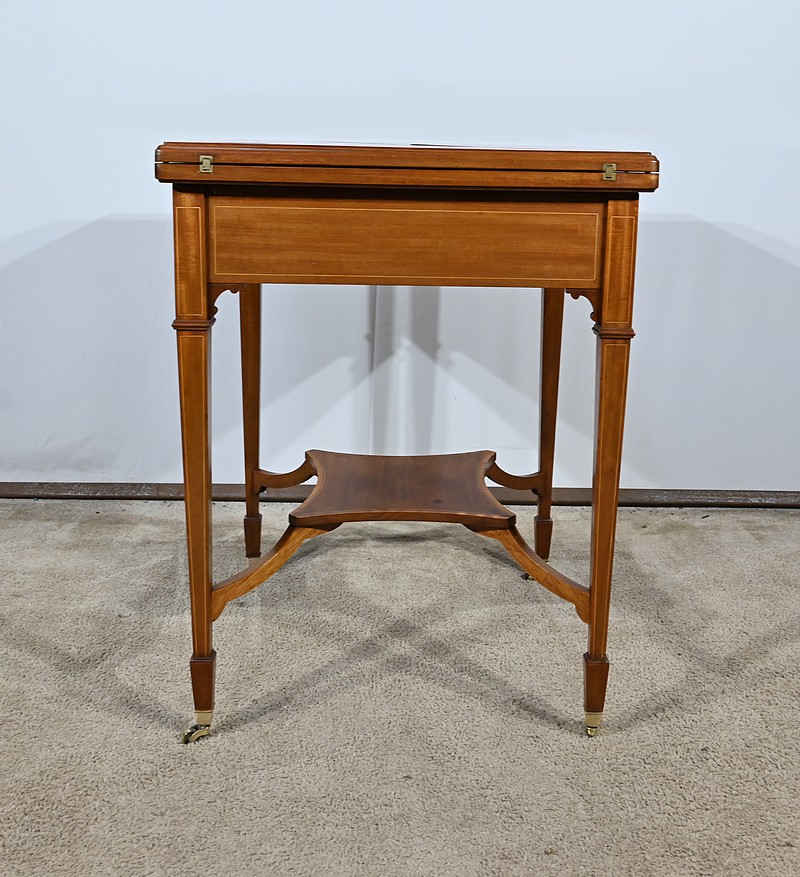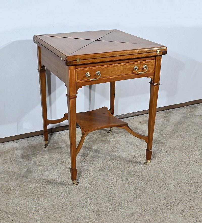 Belle table en acajou massif ornée d’incrustations de bois de rose avec plateau mouchoir se transformant en table à jeux.