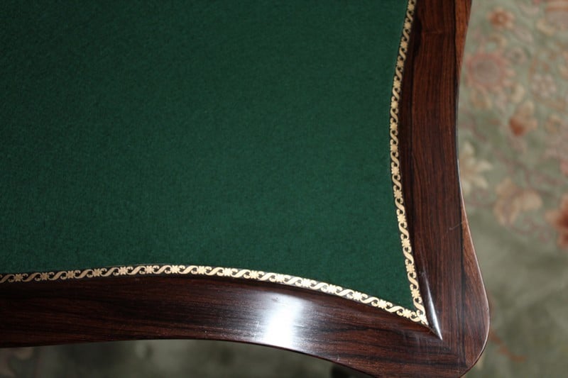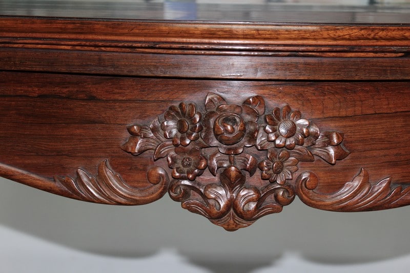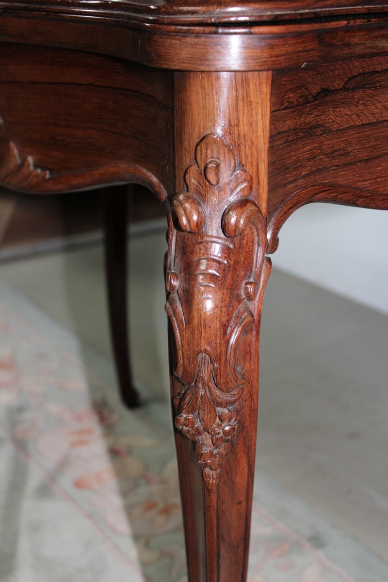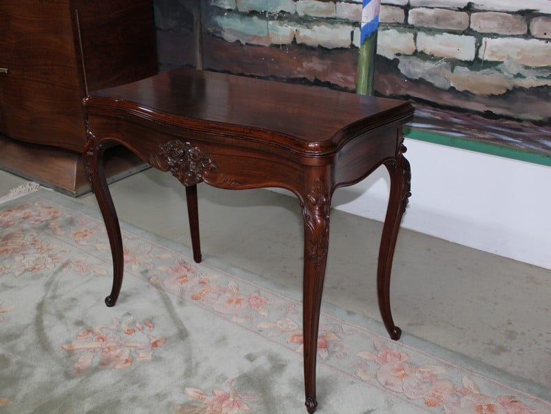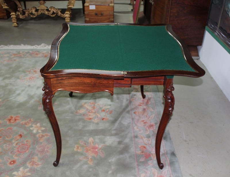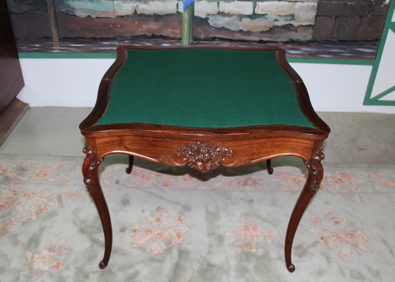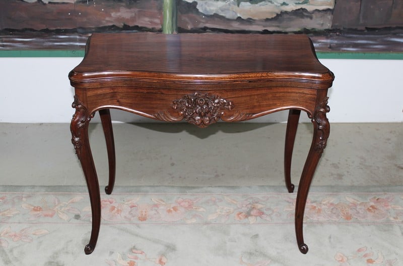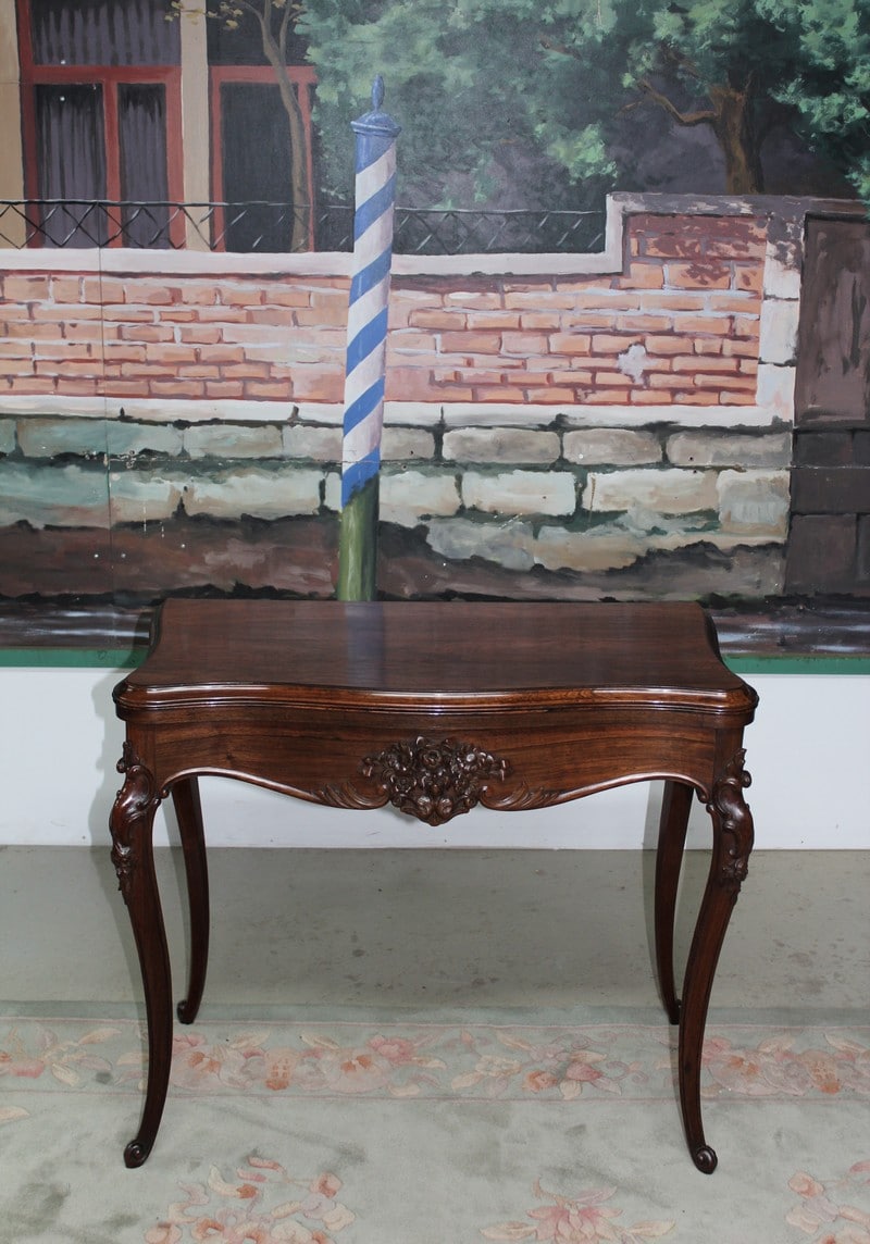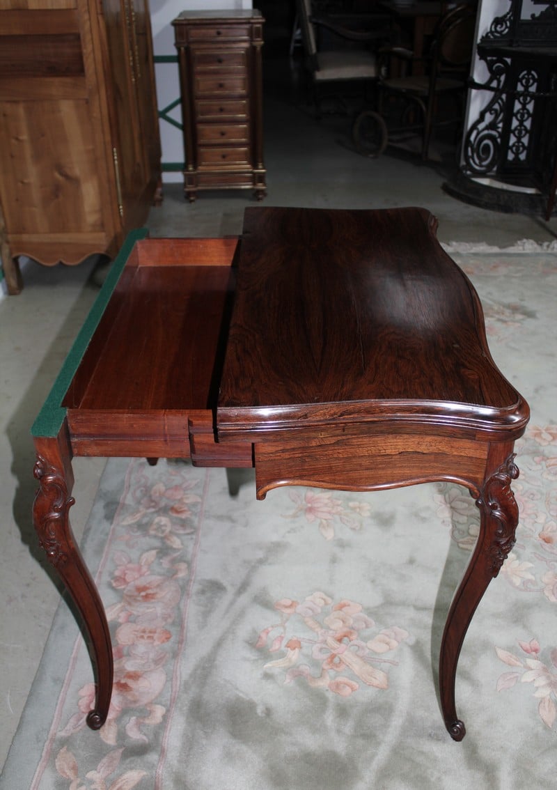 Table à jeux en Palissandre, de style Louis XV, à décor sculpté de fleurs, époque NAPOLÉON III – seconde moitié du XIXe. Ouverte, elle est recouverte d’une feutrine verte changée. Finition cirée.