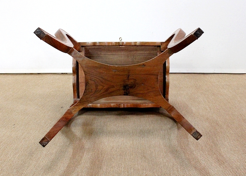 L’ensemble de cette travailleuse est agrémenté de légères baguettes sur toutes les faces et repose sur quatre pieds excessivement cambrés en noyer massif à défoncement sur les côtés, sculptés de sillons en partie haute.