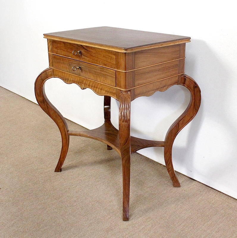 Ravissante table travailleuse entièrement en noyer blond ouvrant sur le dessus par un abattant muni en son centre d’un miroir encadré de baguettes et découvrant un espace de rangement conséquent. Cet abattant se ferme par une serrure d’origine en état de fonctionnement accompagnée de sa clé.