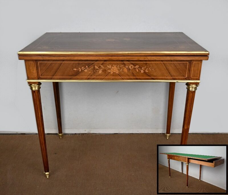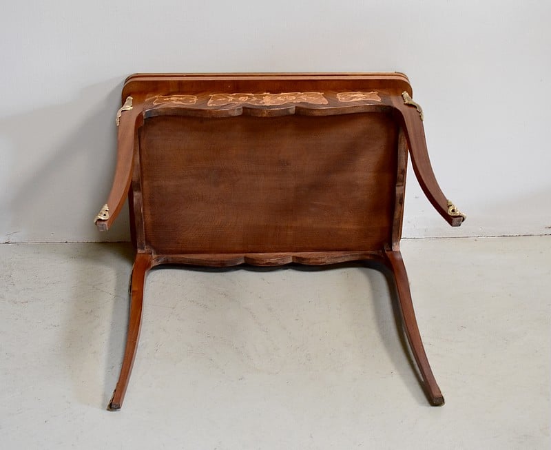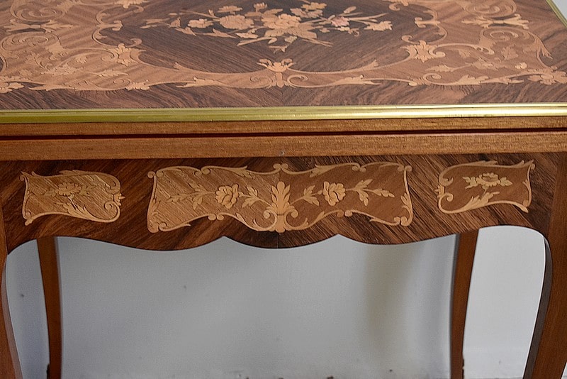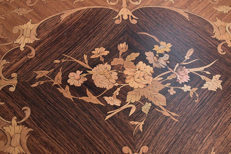 Une marquèterie représentant des motifs floraux est également présente en ceinture découpée sur toutes les faces, faisant écho au plateau.