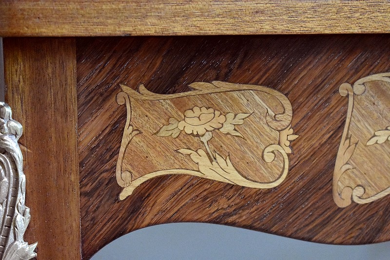 Son plateau est incrusté de marquèterie d’acajou naturel, de citronnier, de bois clair et de bois teinté sur fond de palissandre en frise, représentant des bouquets de fleurs encadrés de motifs floraux et de rinceaux.
