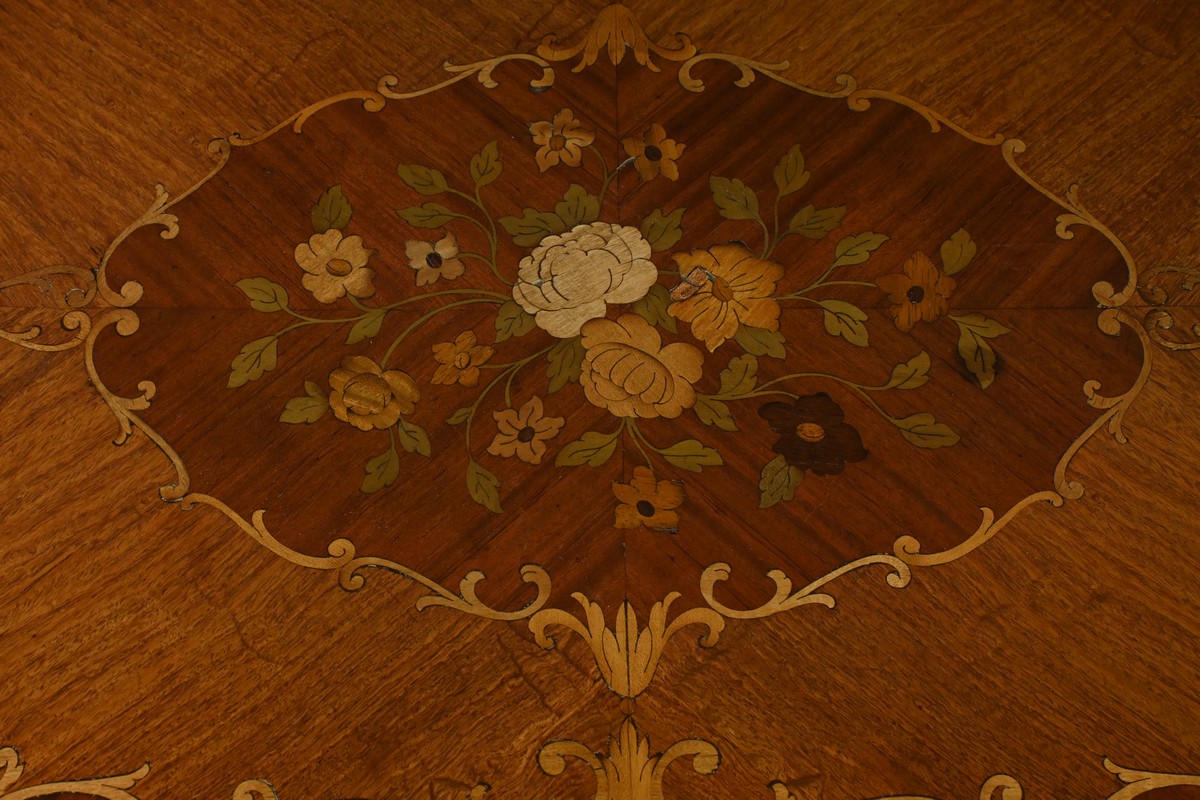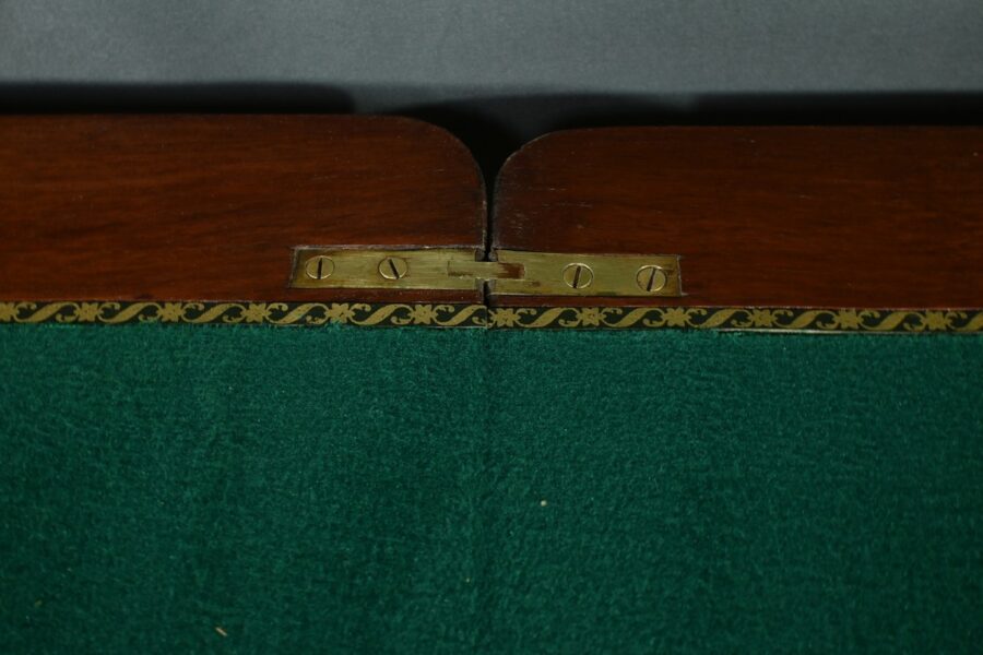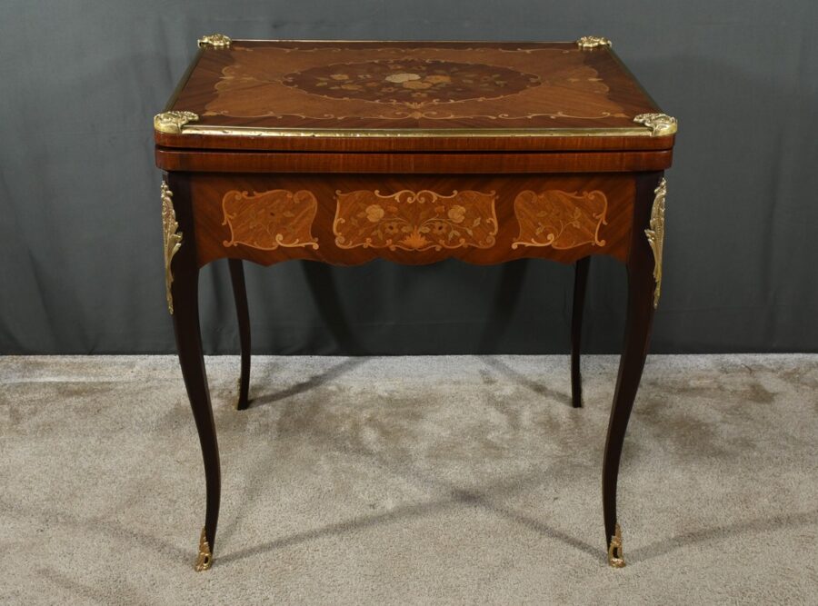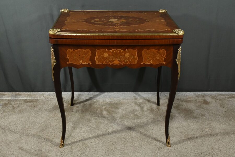 Son plateau, magnifiquement orné de marqueterie à décor de fleurs, est souligné par une lingotière et des motifs d’angle en bronze, ajoutant une touche d’élégance et de raffinement. En se dépliant, le plateau révèle une table de jeux habillée d’une feutrine verte et de galons, parfaite pour des soirées de jeux conviviales.
