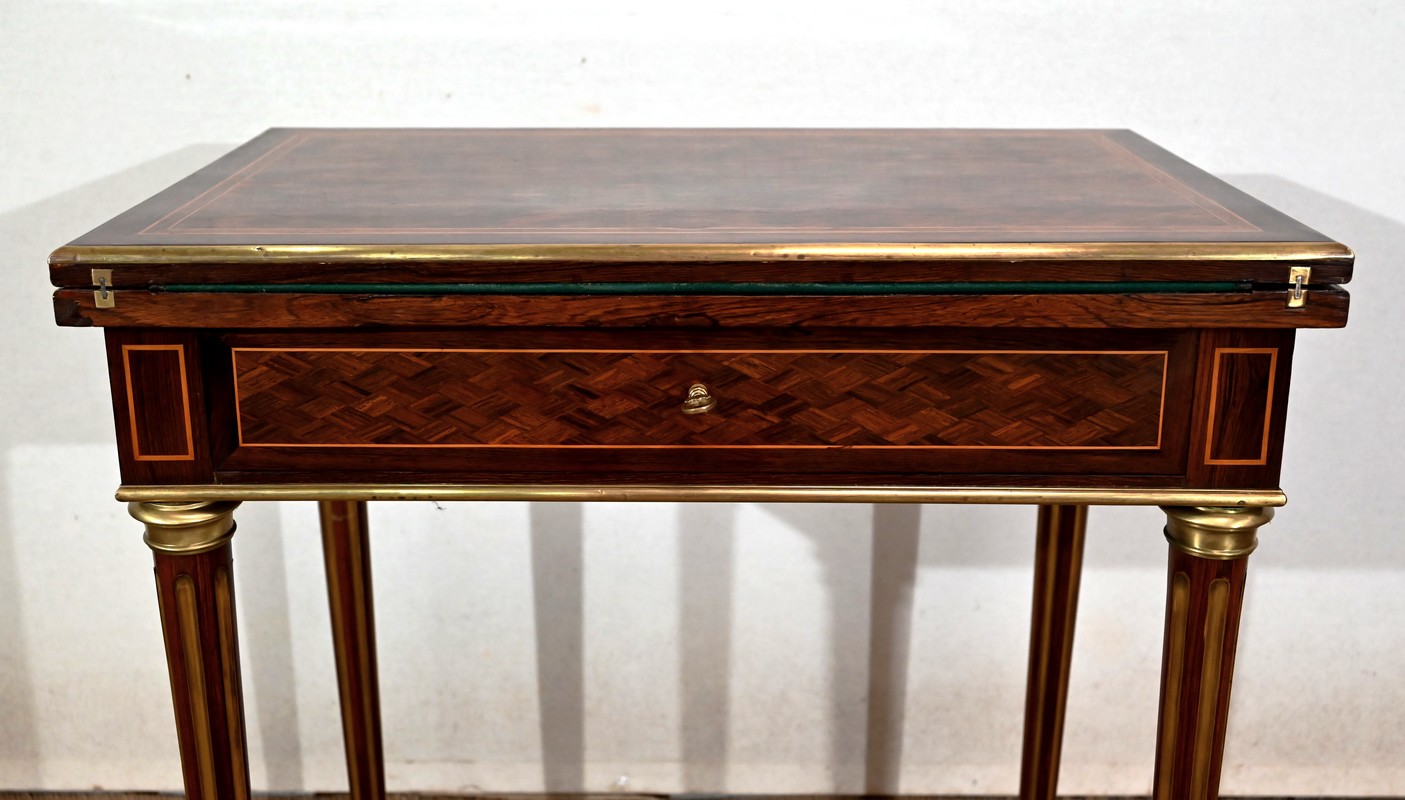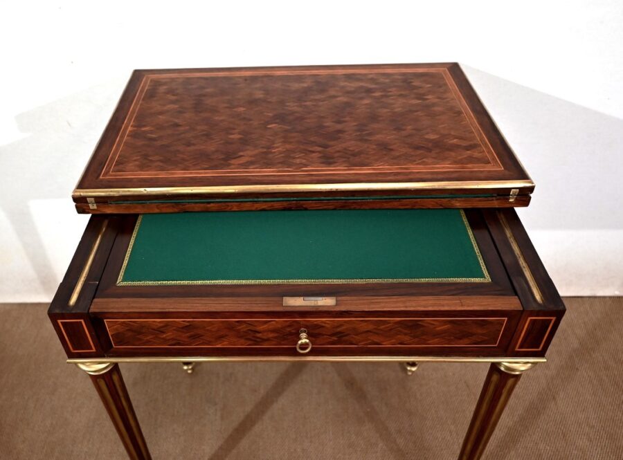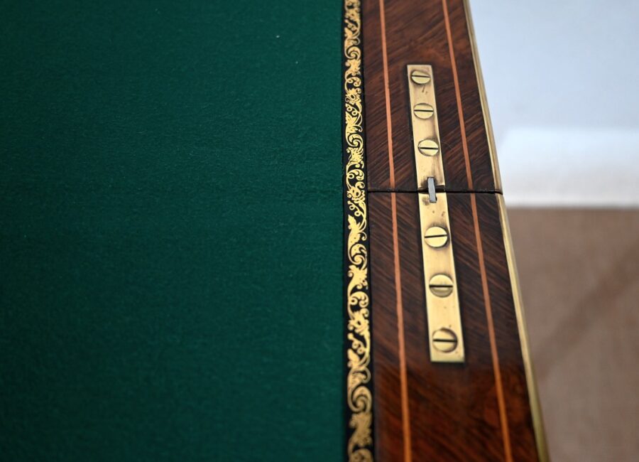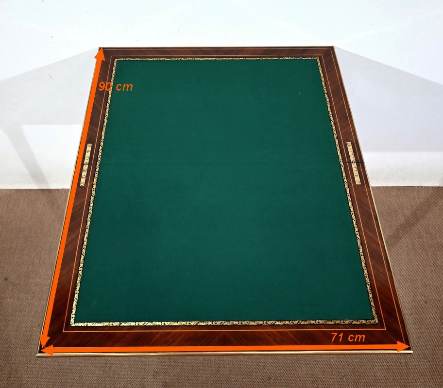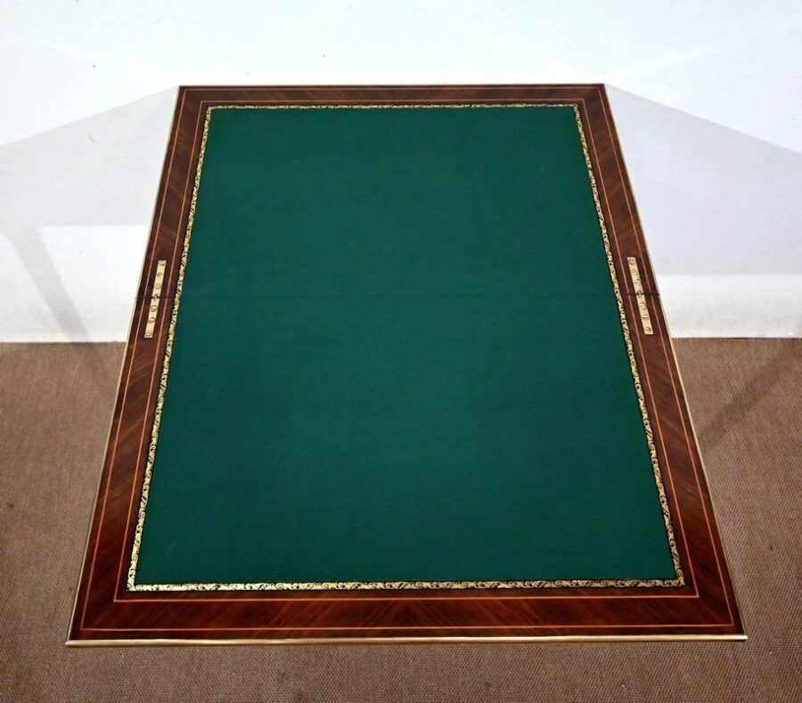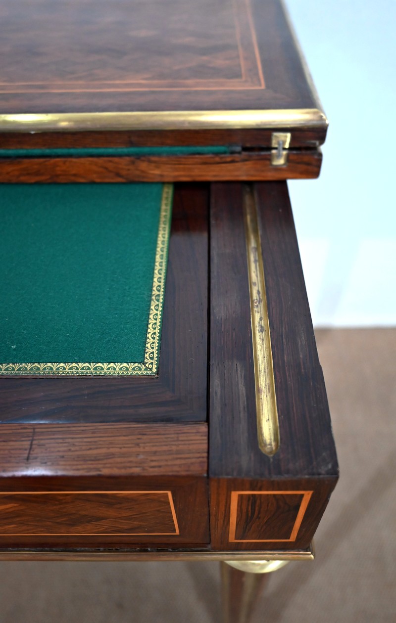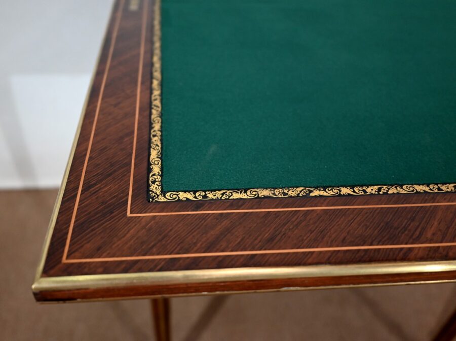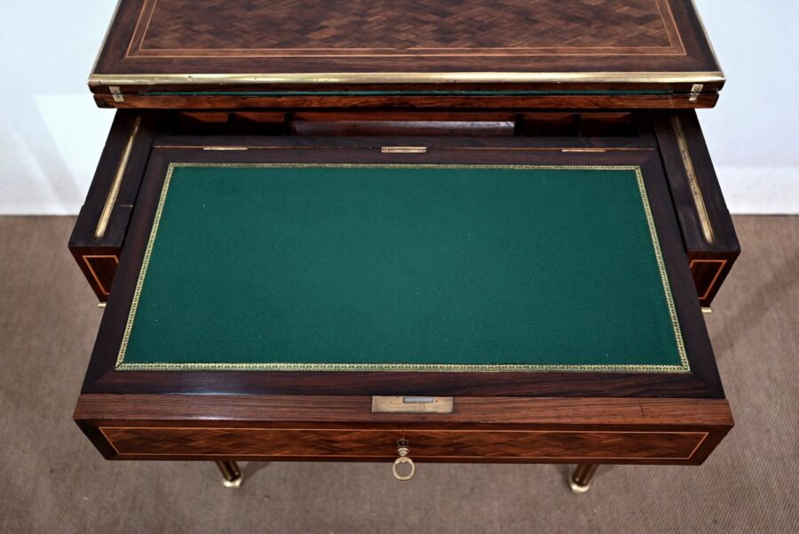 Le double plateau se déploie, offrant une table de jeux garnie d’un feutre à vignette dorée. Le pourtour est en placage de palissandre disposé en frise et incrusté de deux filets de citronnier.