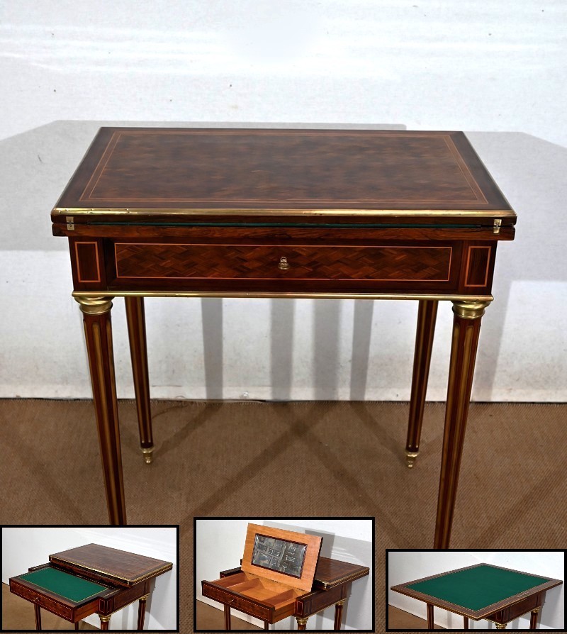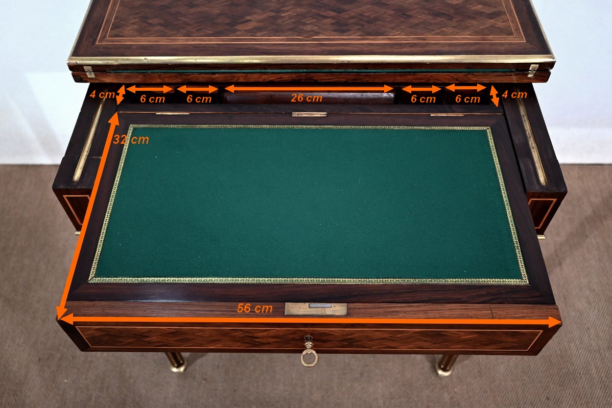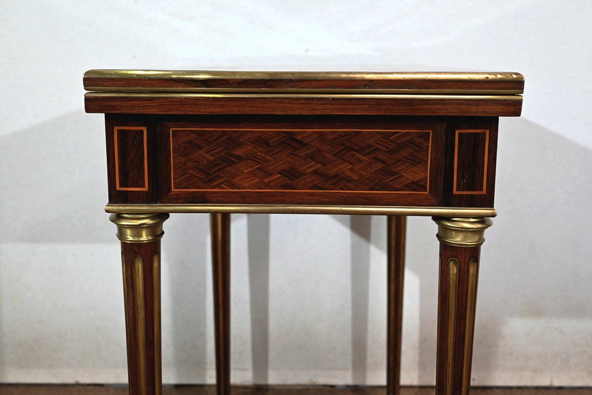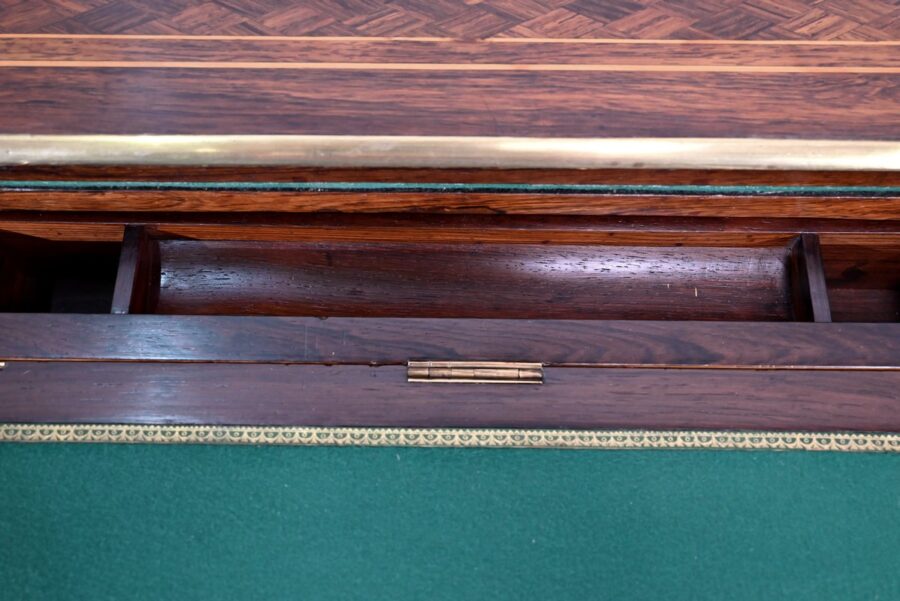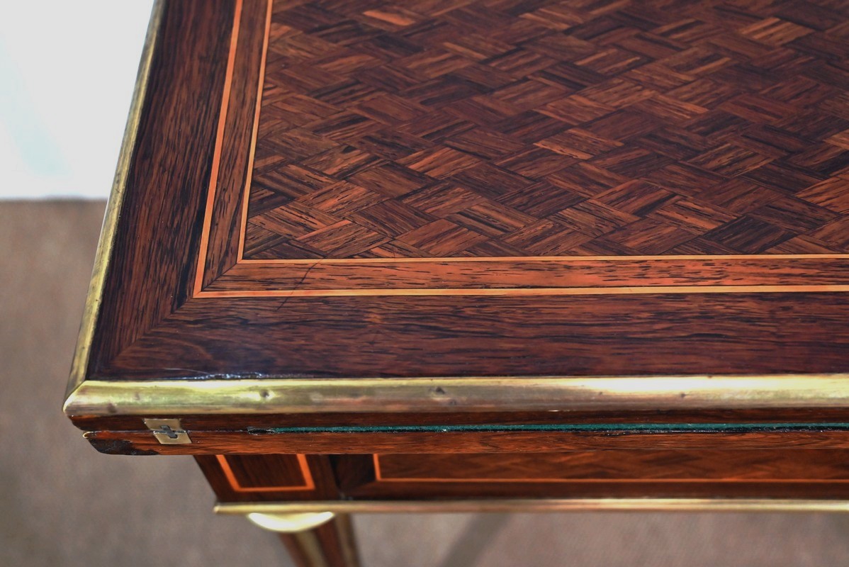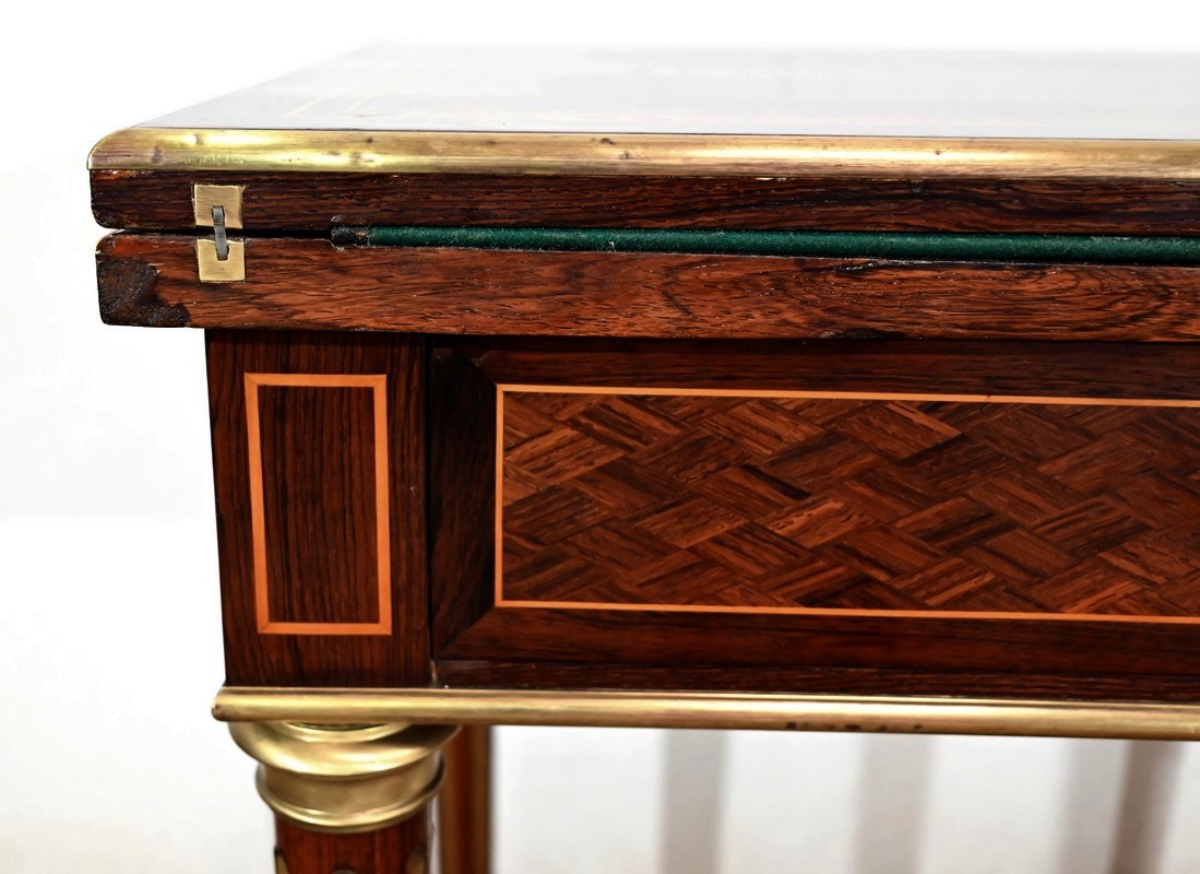 Le double plateau se déploie, offrant une table de jeux garnie d’un feutre à vignette dorée. Le pourtour est en placage de palissandre disposé en frise et incrusté de deux filets de citronnier.
