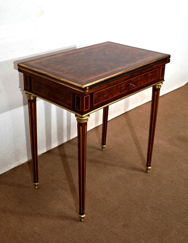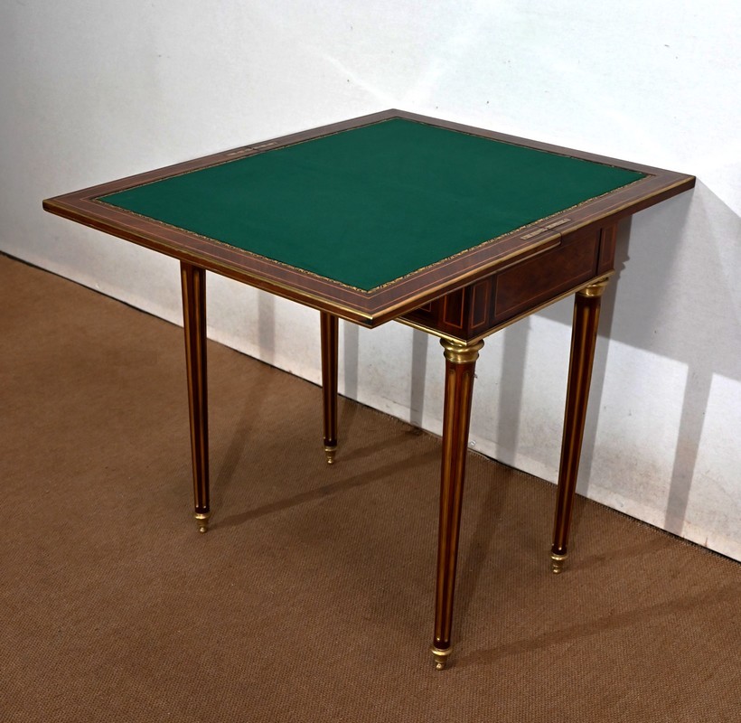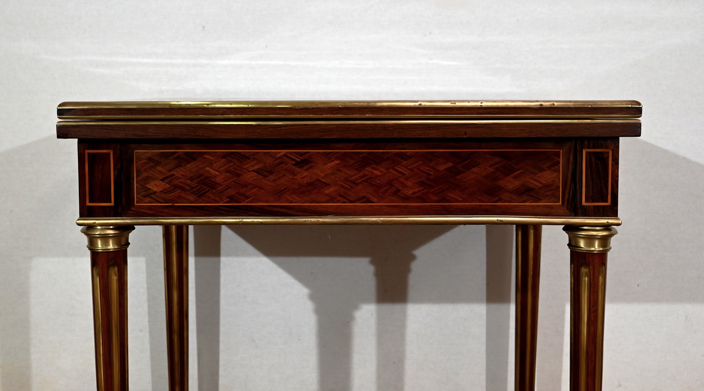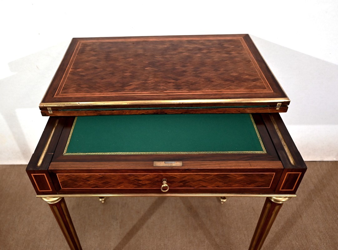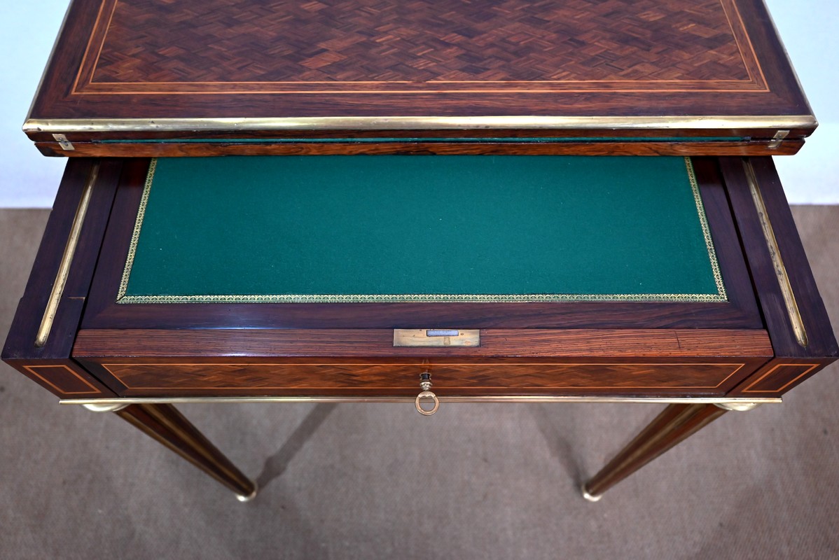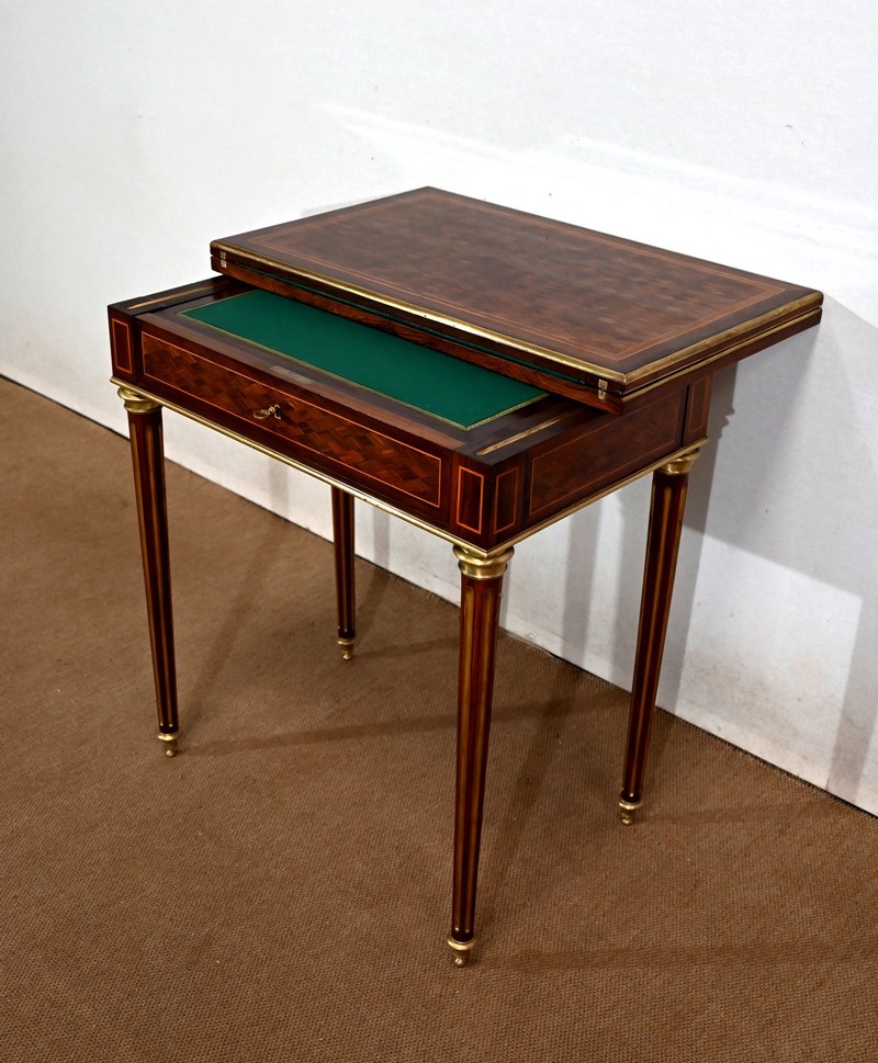 Le double plateau se déploie, offrant une table de jeux garnie d’un feutre à vignette dorée. Le pourtour est en placage de palissandre disposé en frise et incrusté de deux filets de citronnier.