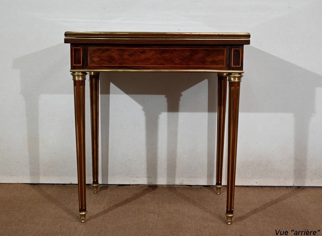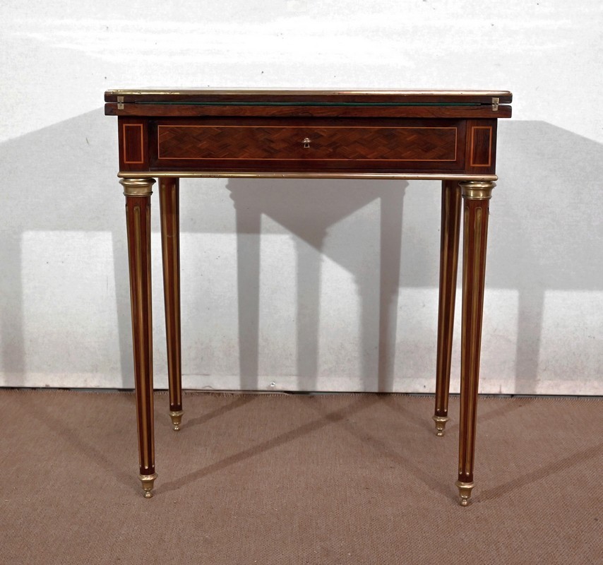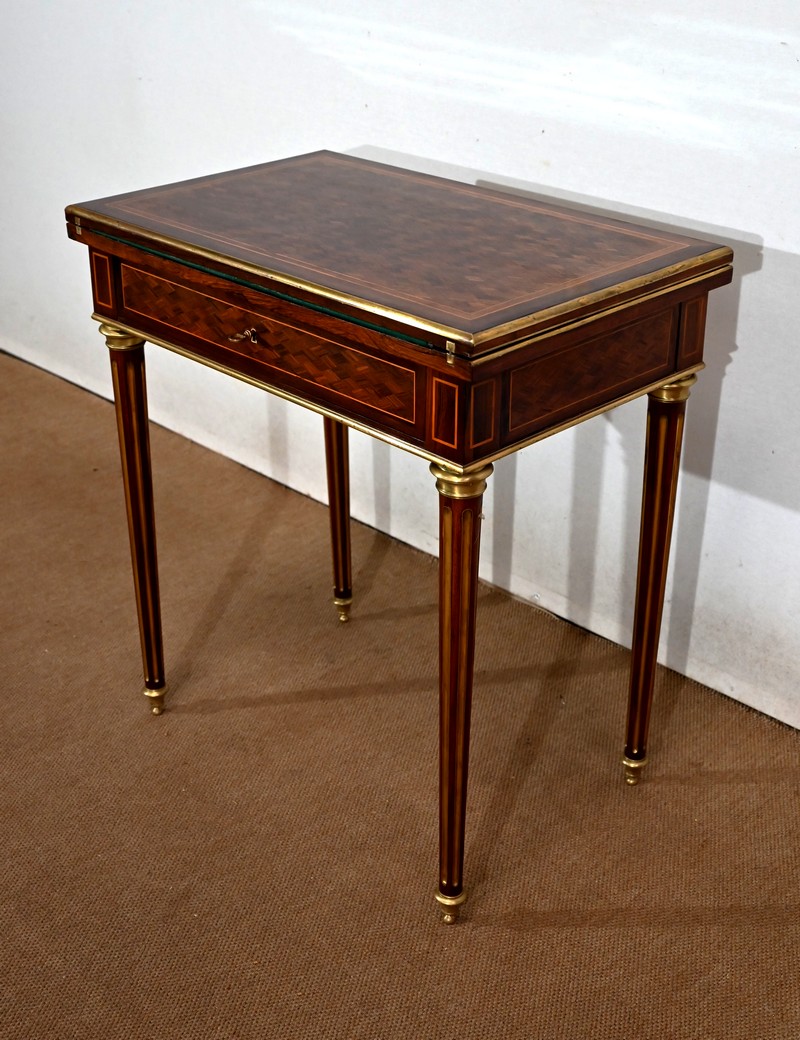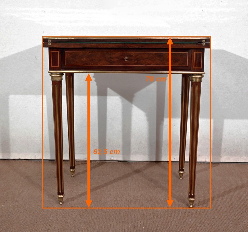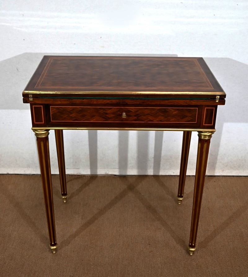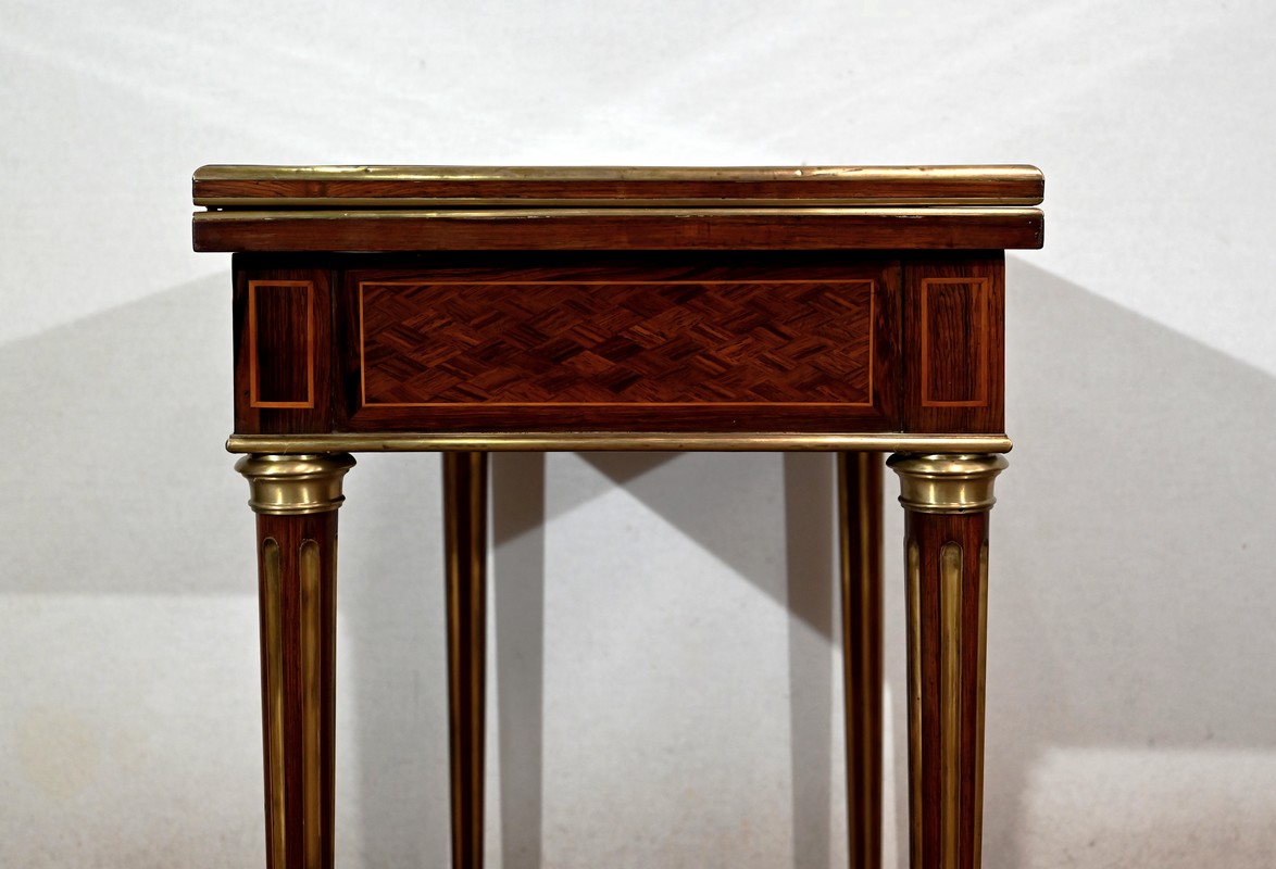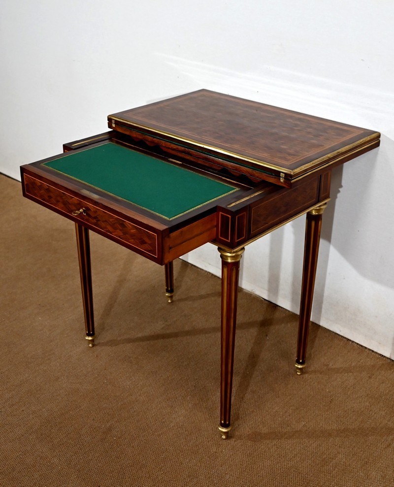 Le double plateau se déploie, offrant une table de jeux garnie d’un feutre à vignette dorée. Le pourtour est en placage de palissandre disposé en frise et incrusté de deux filets de citronnier.