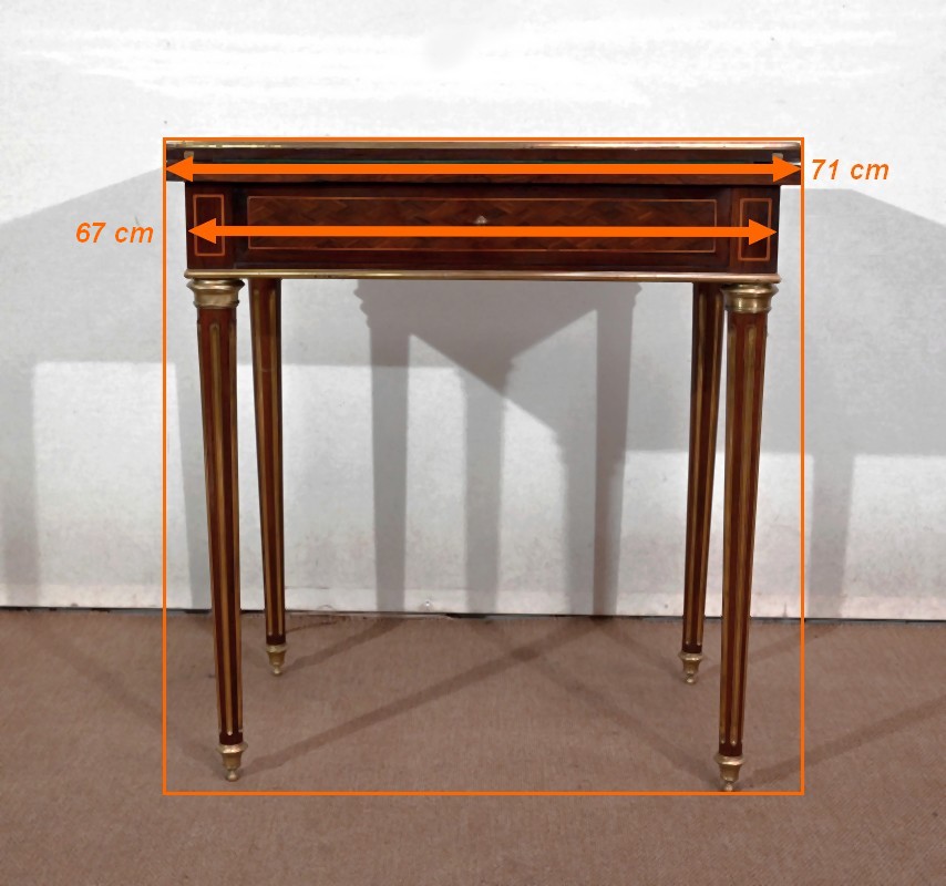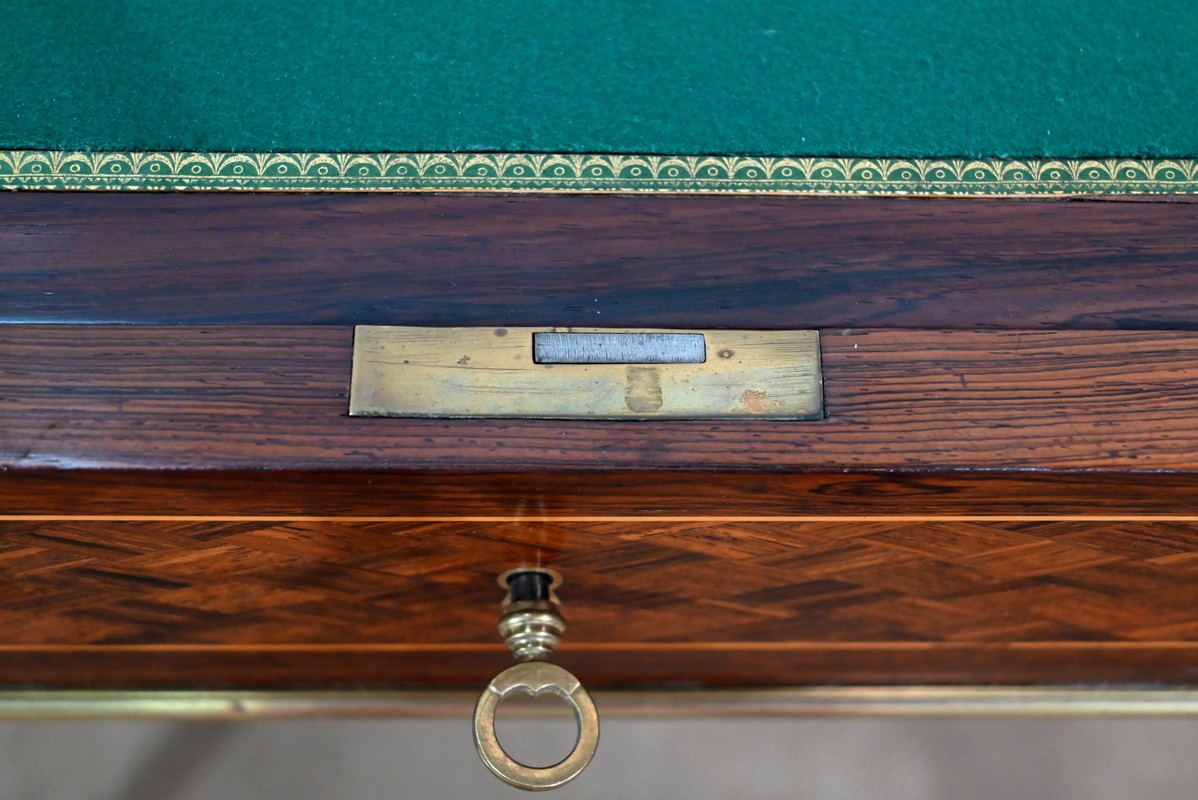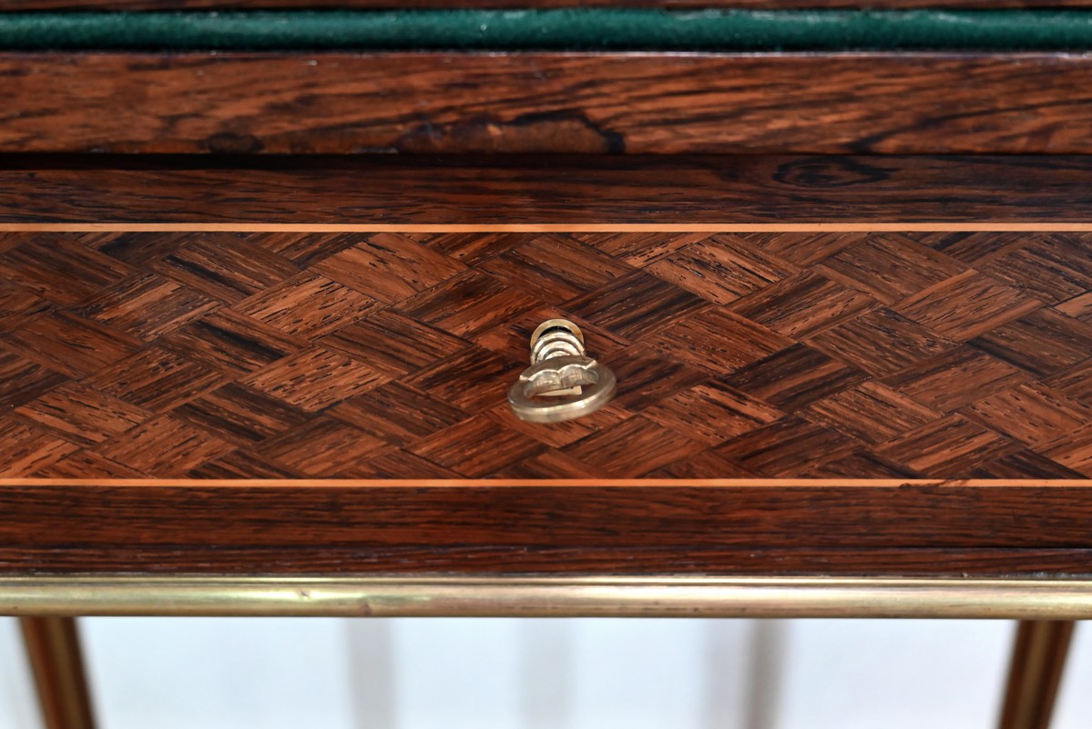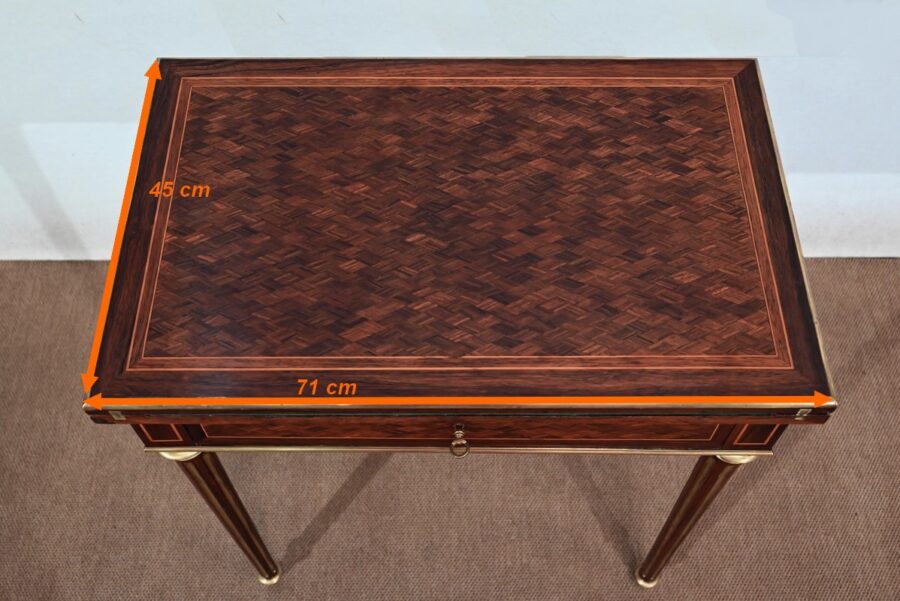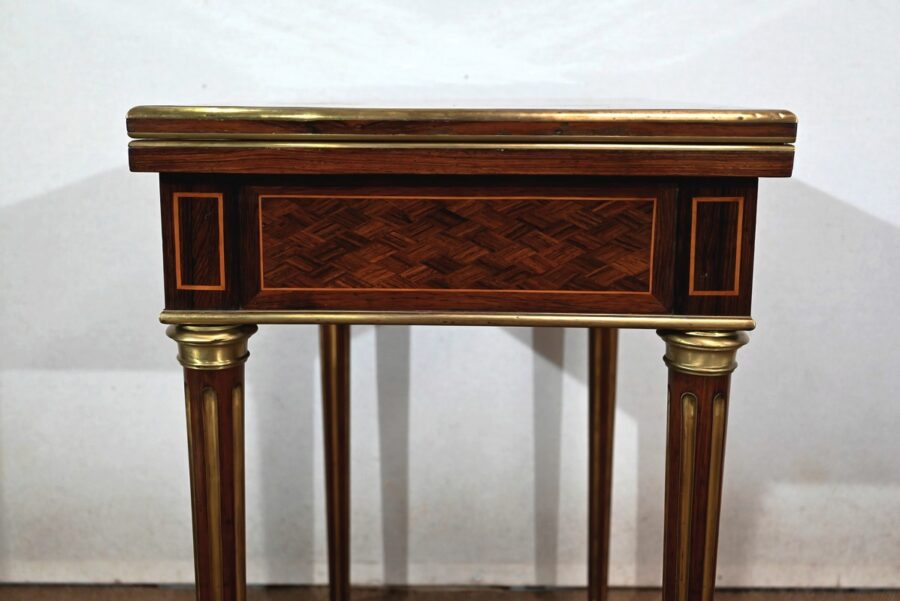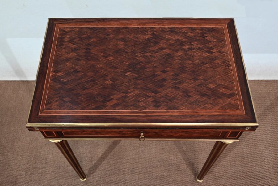 Son plateau rectangulaire est marqueté de petits losanges en placage de palissandre, encadrés d’un double filet de citronnier, d’une bande à coupe d’onglet, puis d’un quart de rond laiton sur l’arête.