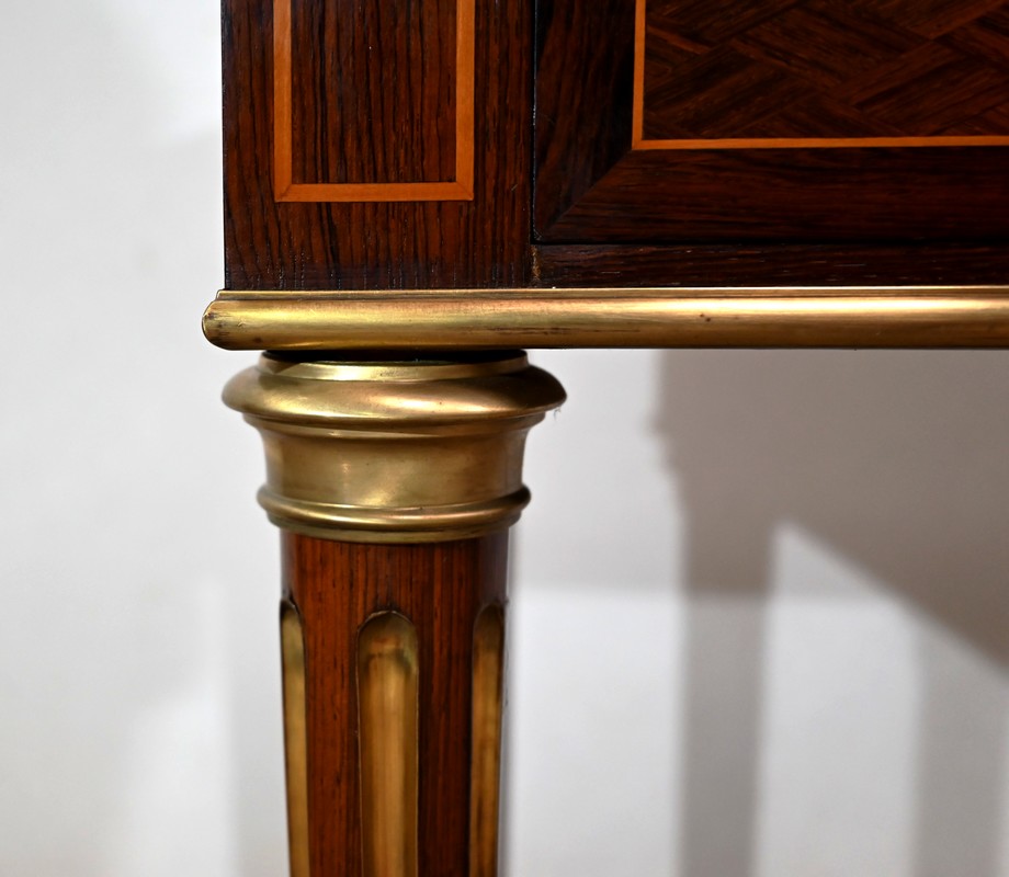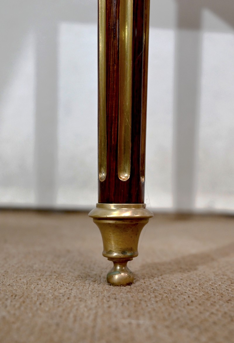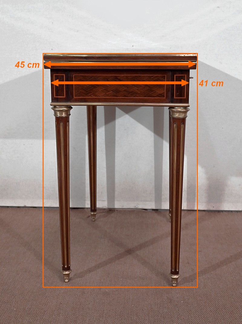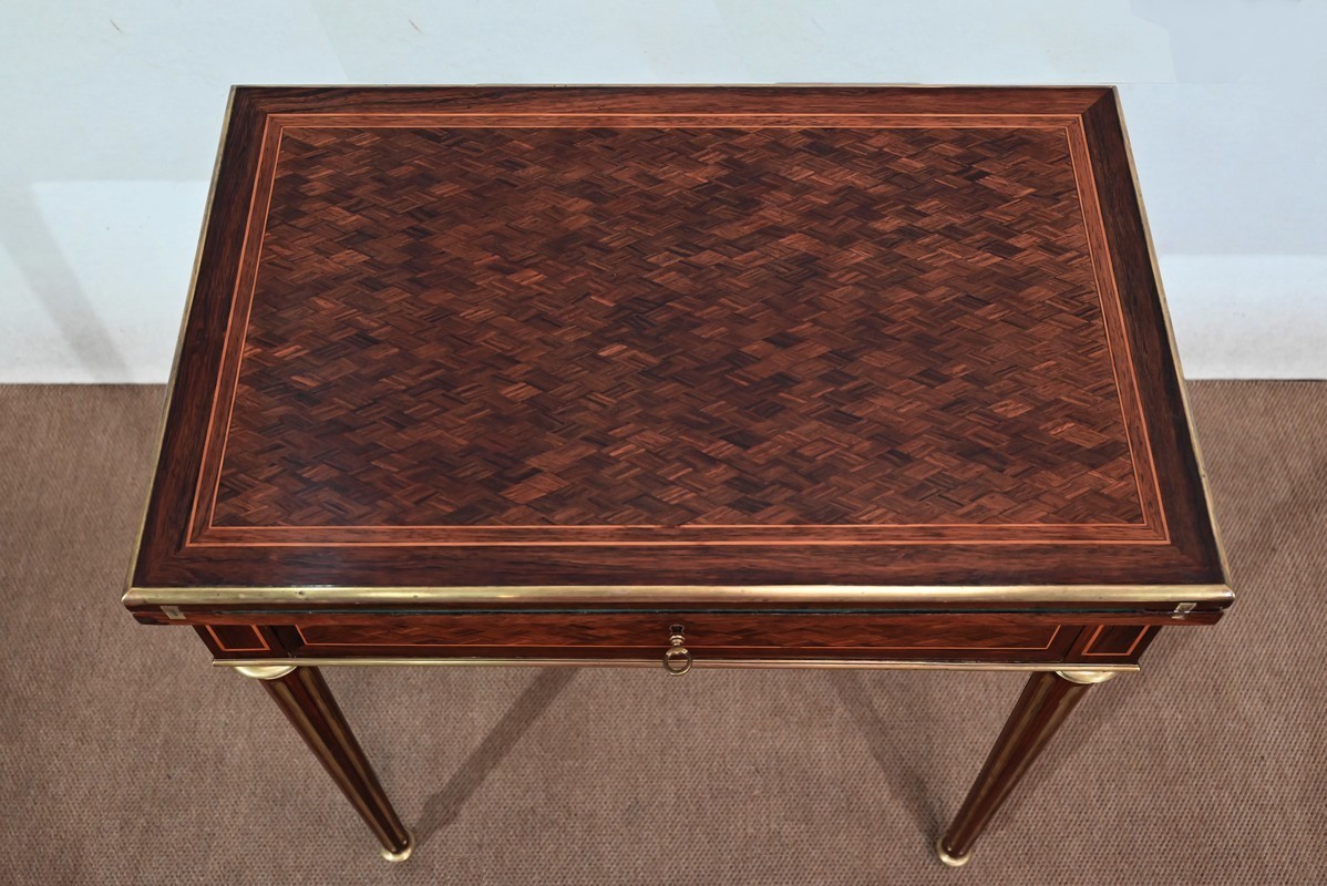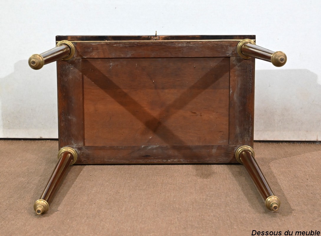 Son plateau rectangulaire est marqueté de petits losanges en placage de palissandre, encadrés d’un double filet de citronnier, d’une bande à coupe d’onglet, puis d’un quart de rond laiton sur l’arête.