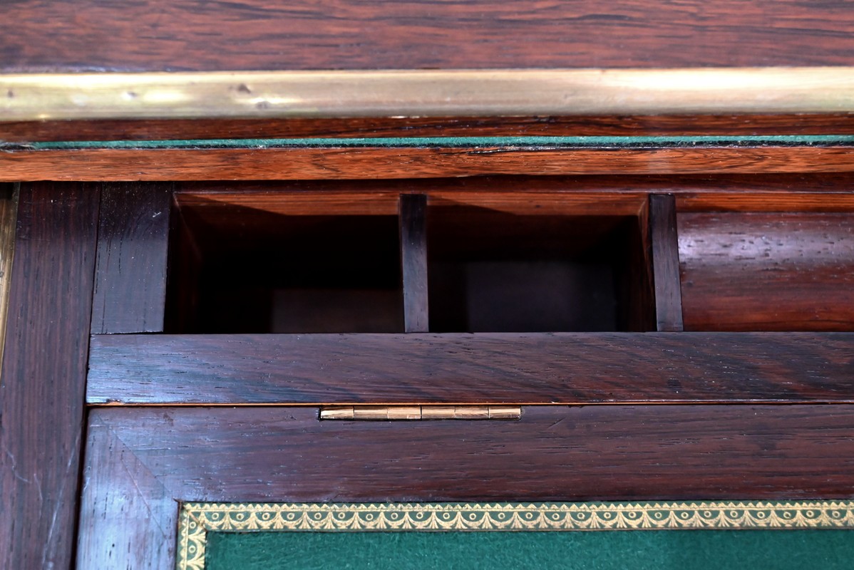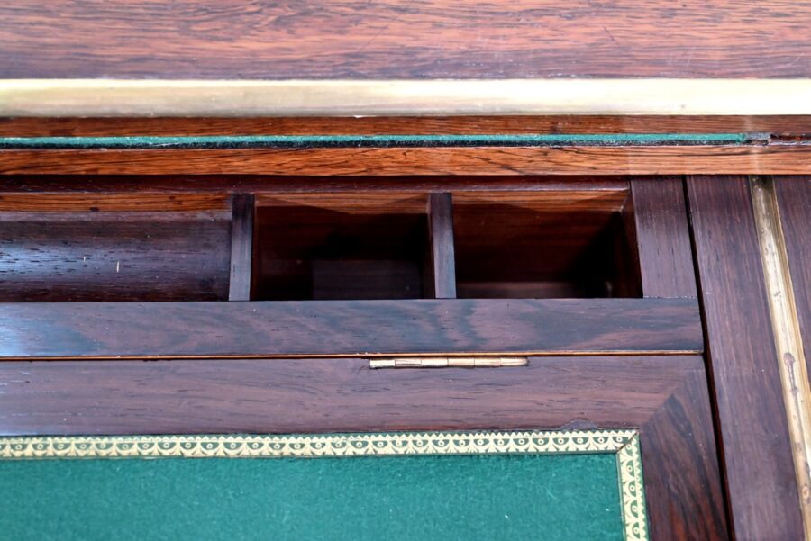 Le double dessus coulisse, révélant un espace écritoire foncé d’une feutrine à vignette dorée, ainsi que des casiers et un plumier.