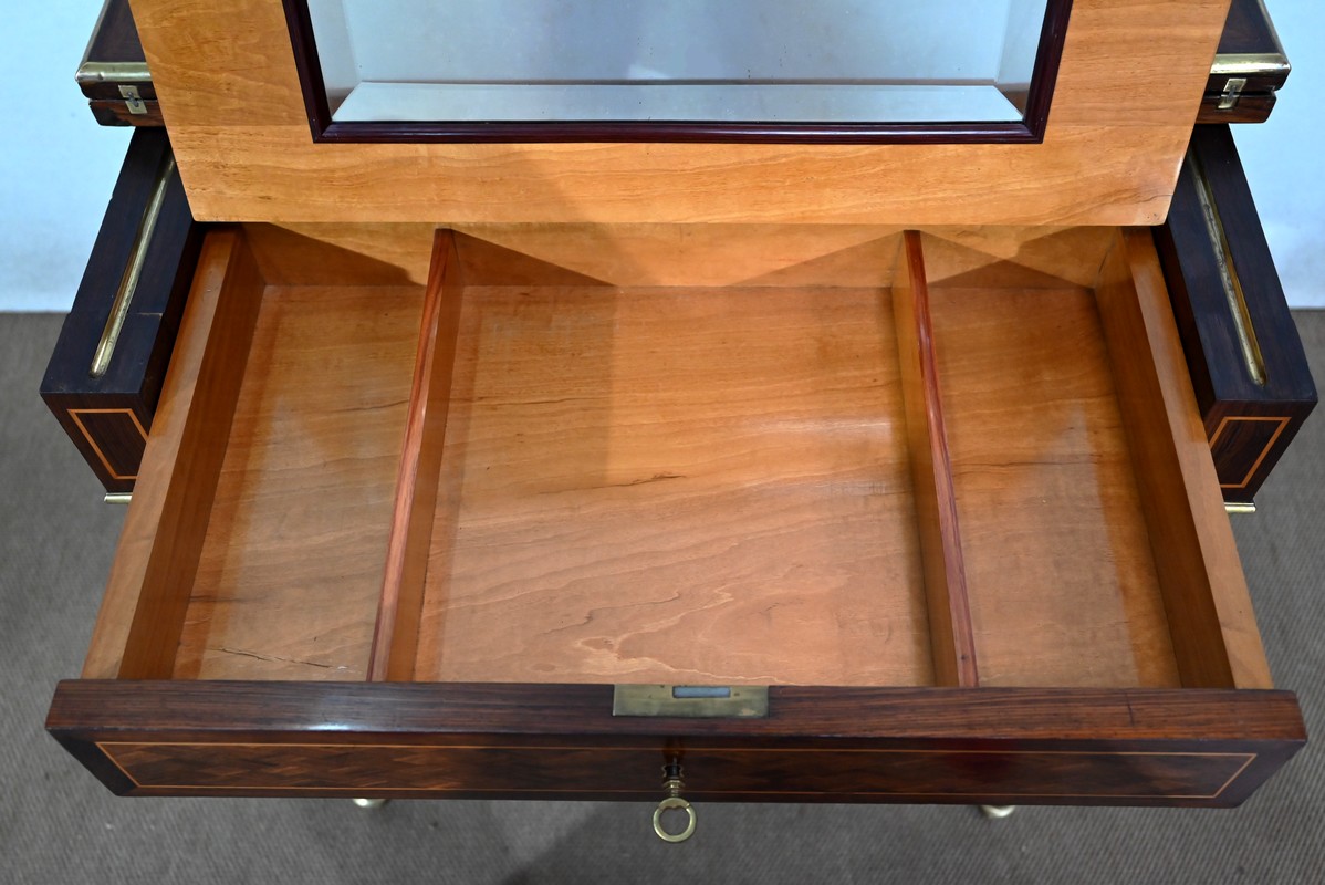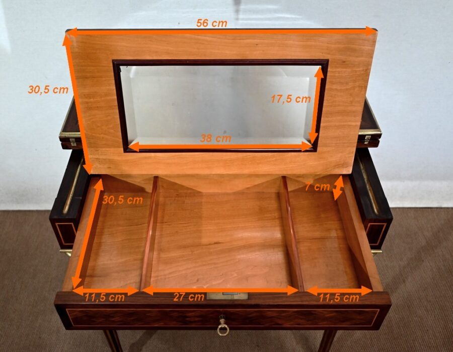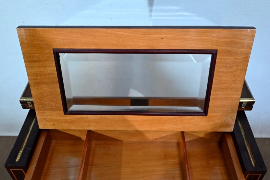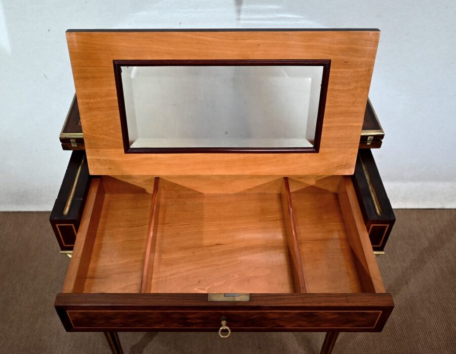 Cette tablette s’ouvre par trois charnières sur une coiffeuse au miroir d’origine biseauté, entouré d’une baguette moulurée en palissandre. L’intérieur, en citronnier, est compartimenté.