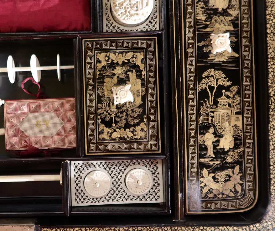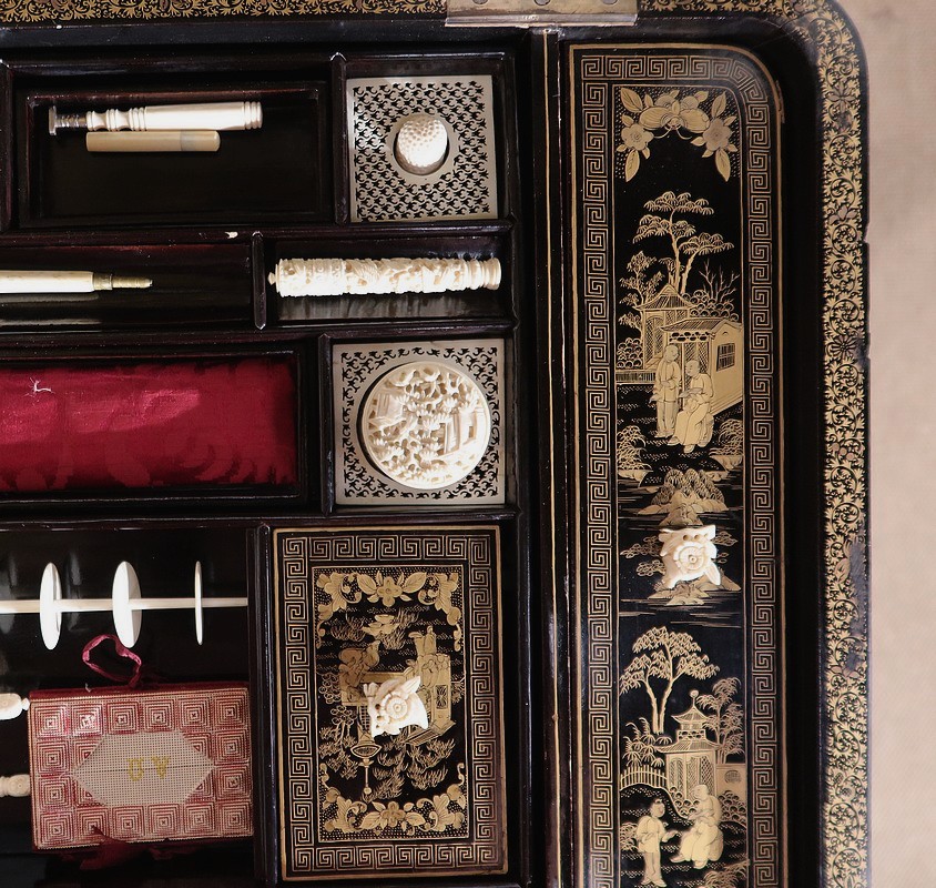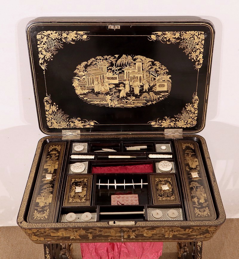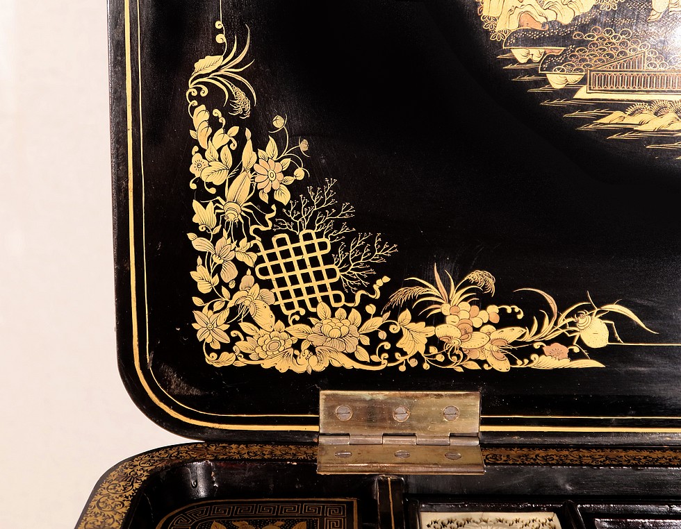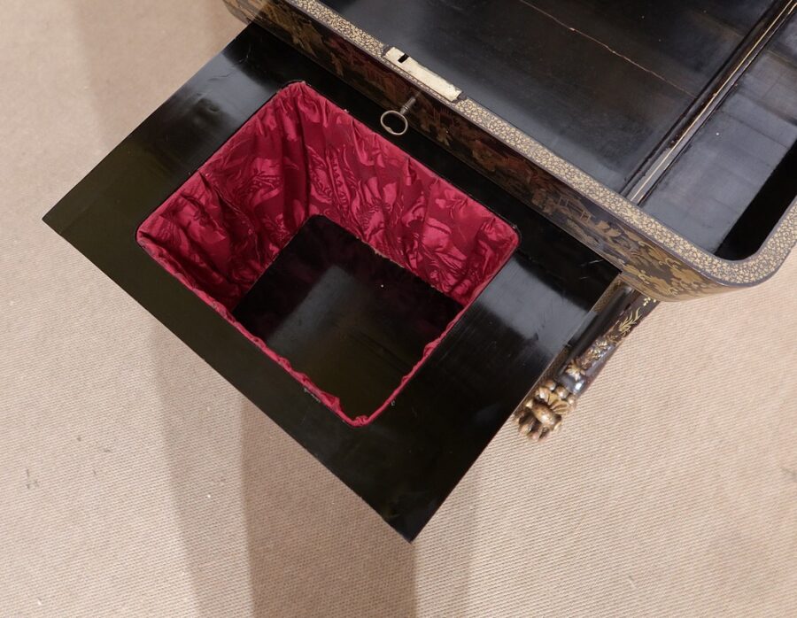 Cette travailleuse ornementée de dorures formant paysages, pagodes et personnages, ouvre par un abattant avec une scène riche présentant l’empereur devant sa cour. Cet abattant s’ouvre à l’aide d’une serrure à crochet en état de fonctionnement.