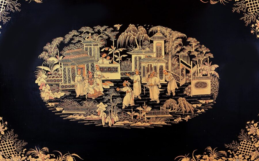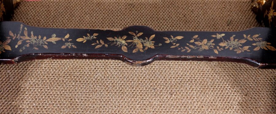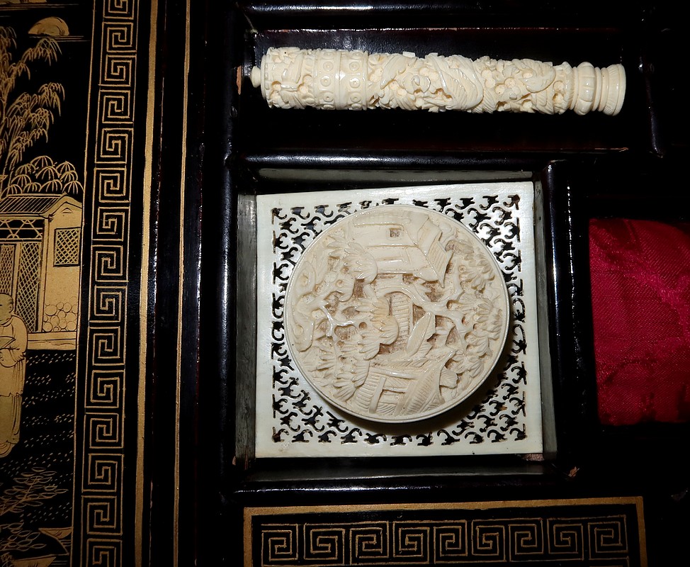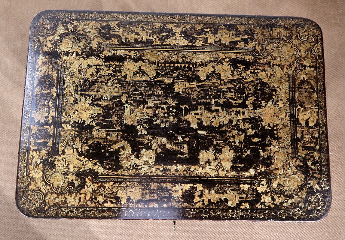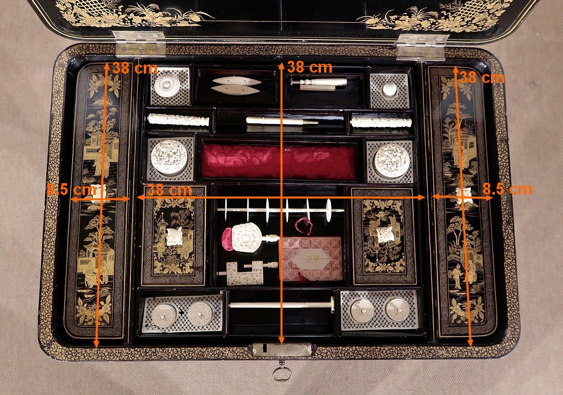 Cette travailleuse ornementée de dorures formant paysages, pagodes et personnages, ouvre par un abattant avec une scène riche présentant l’empereur devant sa cour. Cet abattant s’ouvre à l’aide d’une serrure à crochet en état de fonctionnement.