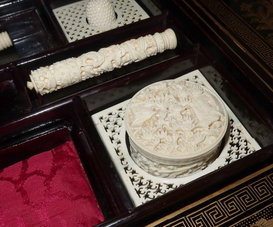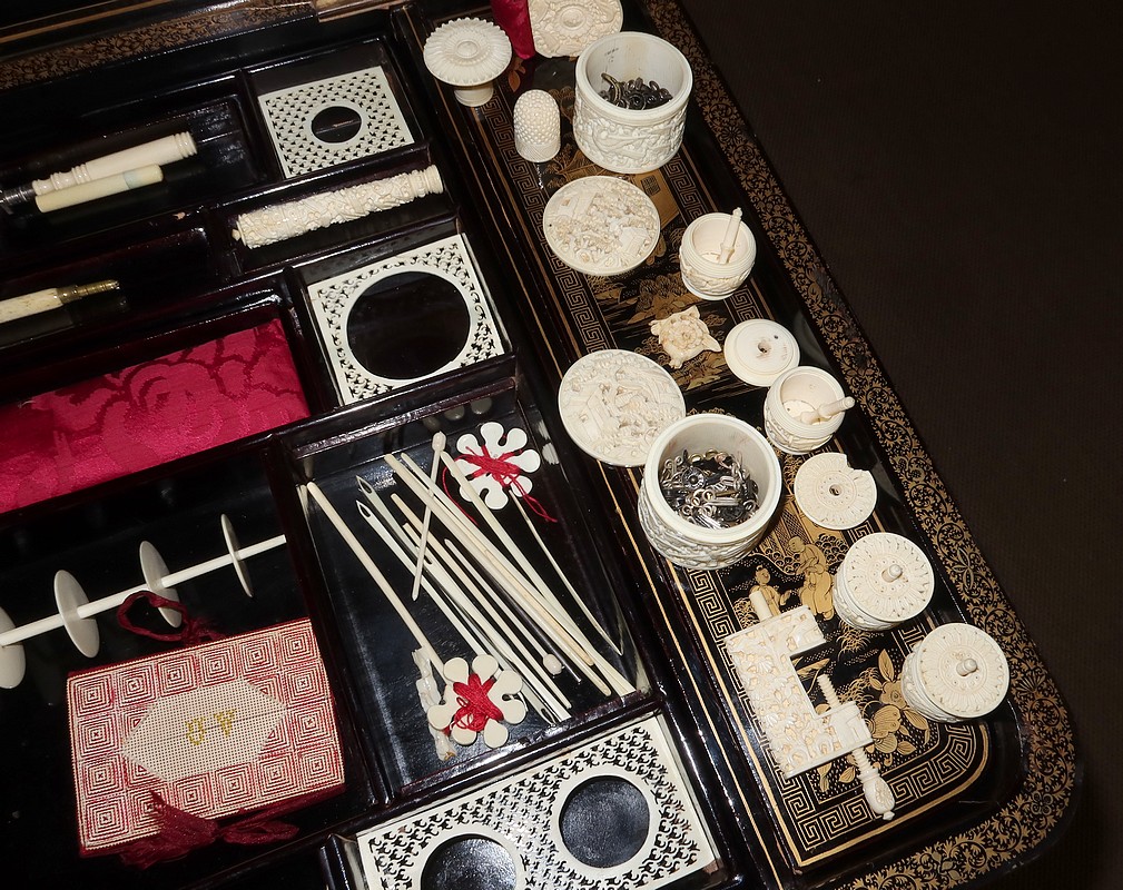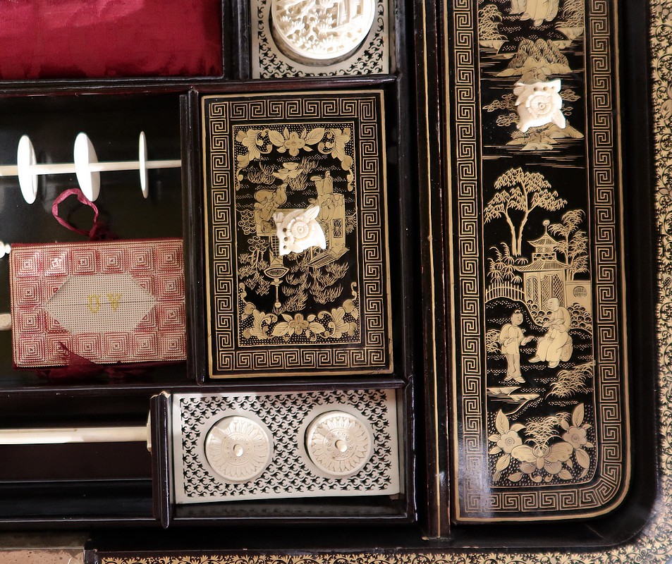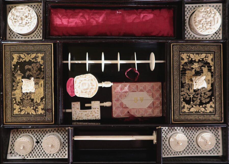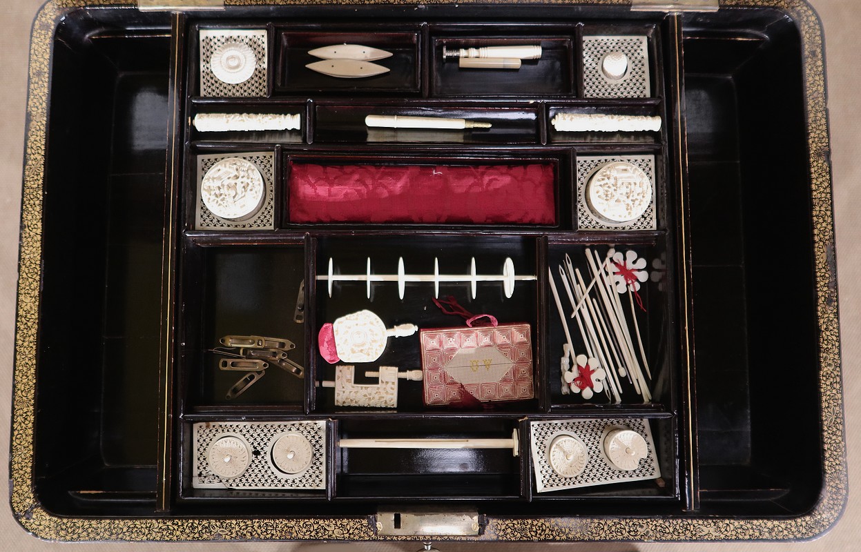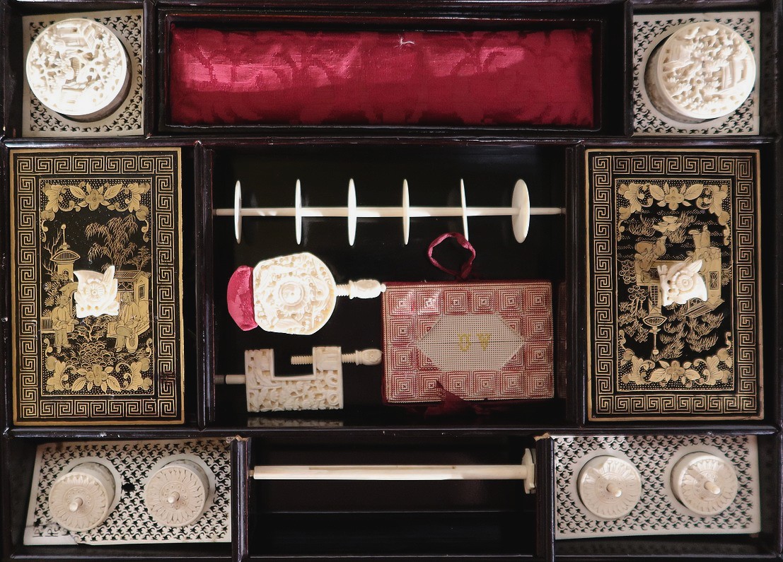 A l’intérieur, nous découvrons un espace de rangement constitué de nombreuses cases agrémentées de boîtes et d’accessoires de couture sculptés minutieusement.
