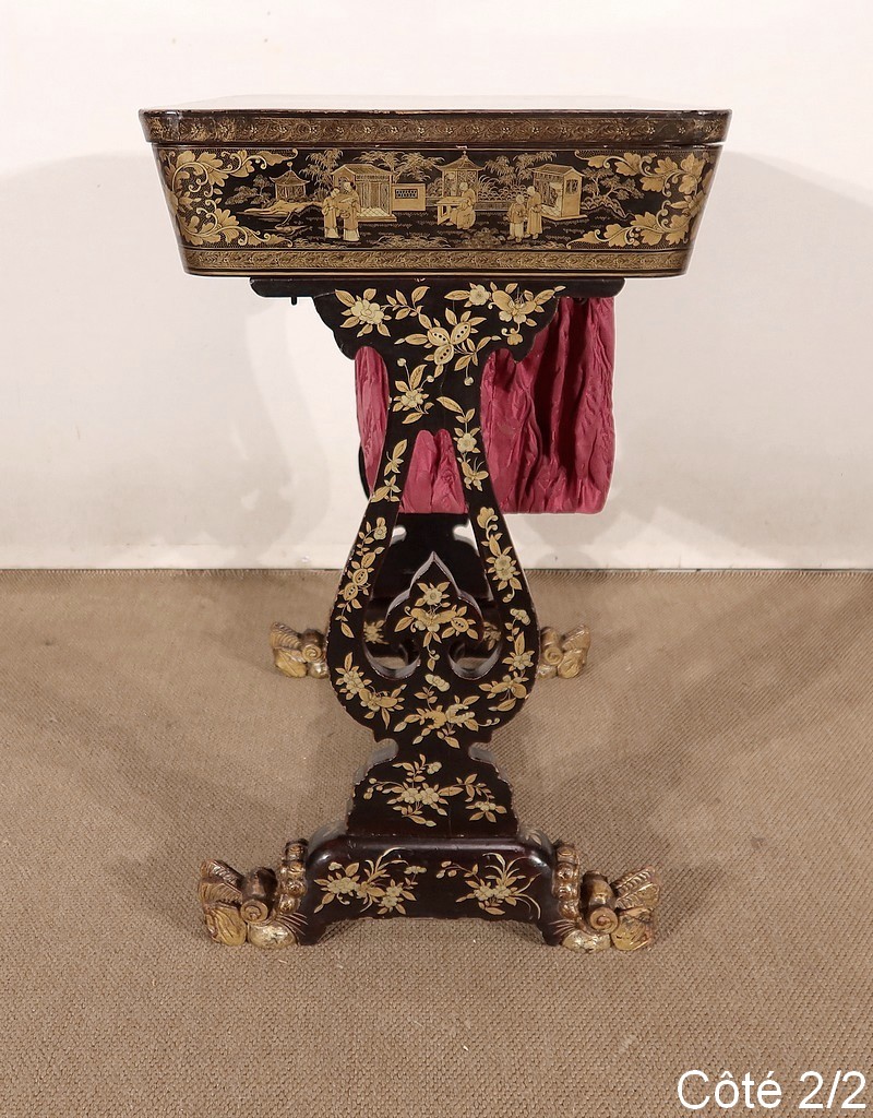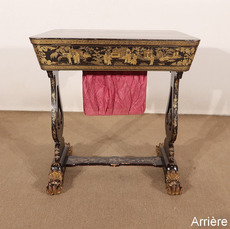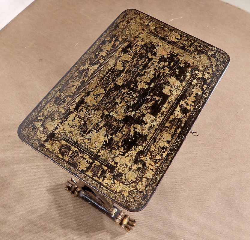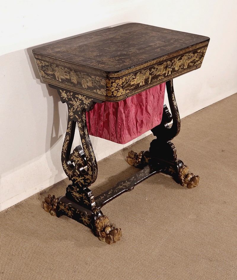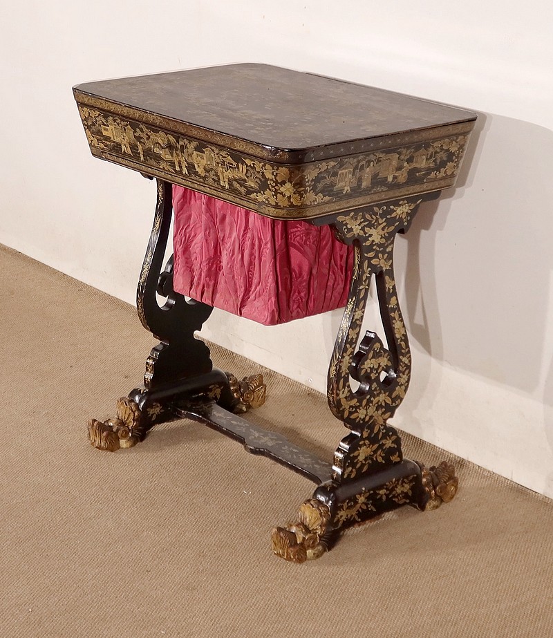 Table à ouvrage laquée, en bois noirci à décor de scènes indochinoises, d’époque Napoléon III.