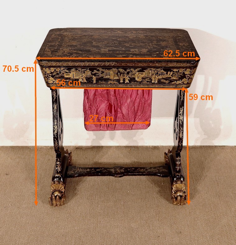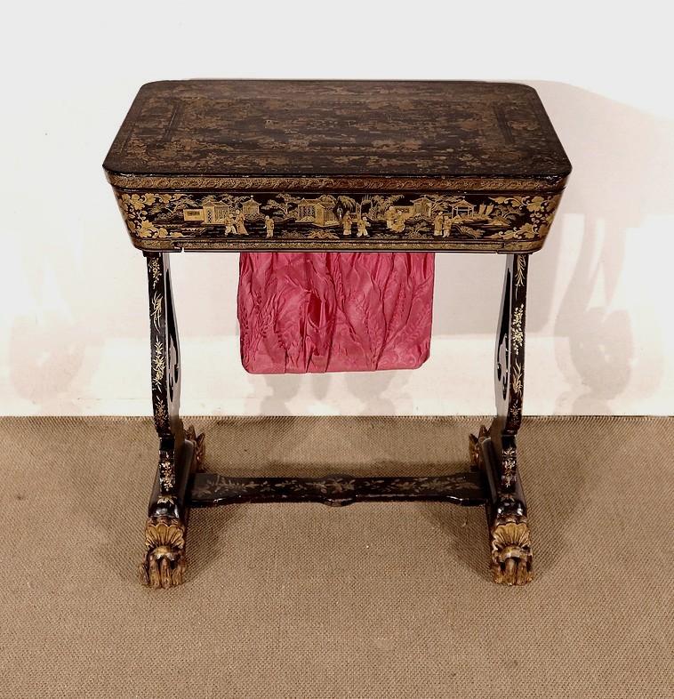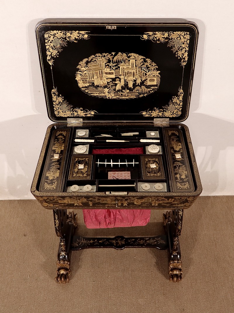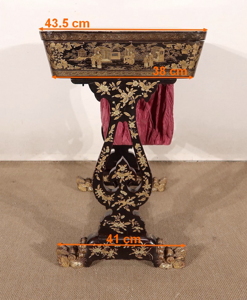Table à ouvrage laquée, en bois noirci à décor de scènes indochinoises, d’époque Napoléon III.