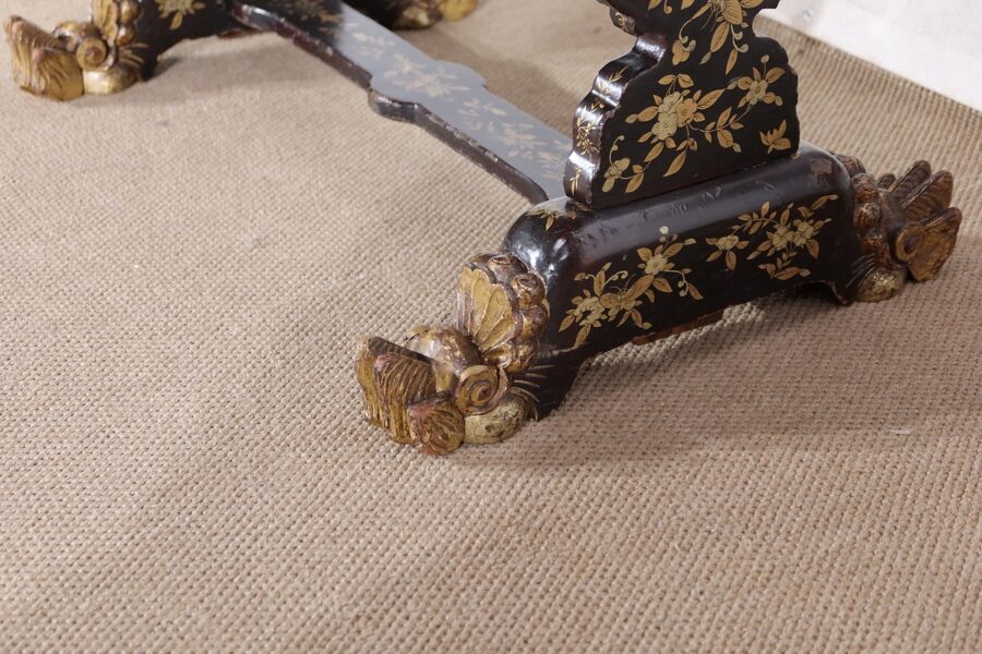 L’ensemble repose sur deux pieds lyre ornés de fleurs délicates. Ils sont reliés par une traverse d’entre-jambe et se terminent par des pieds griffes dorés particulièrement seyants.