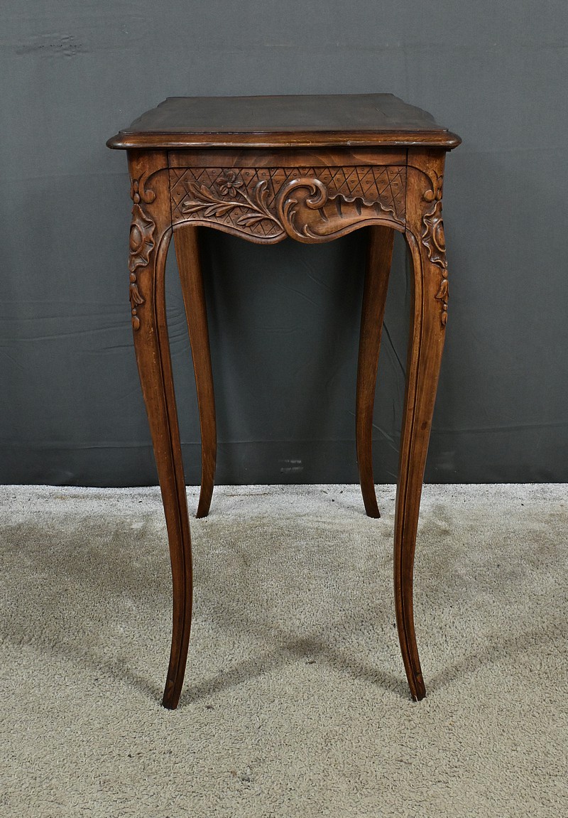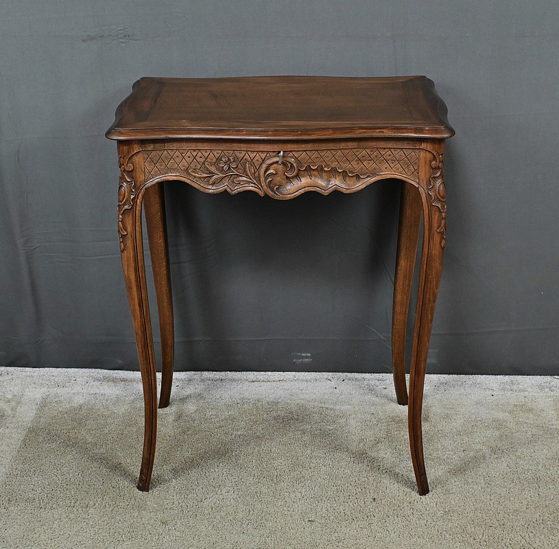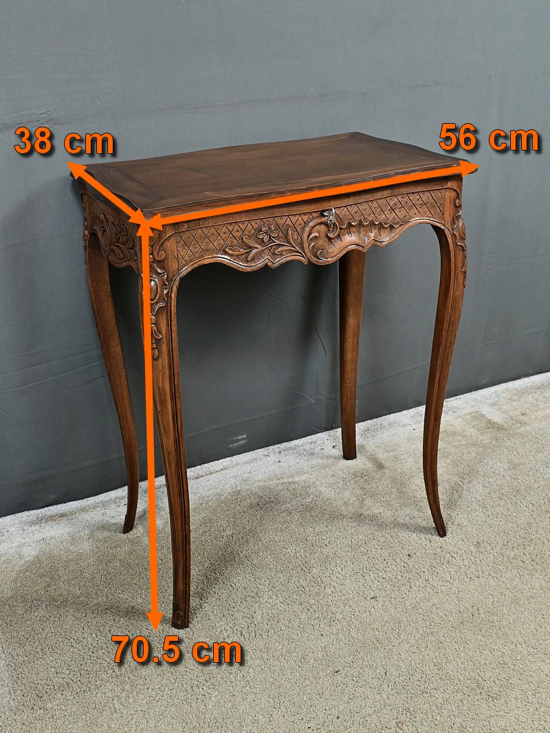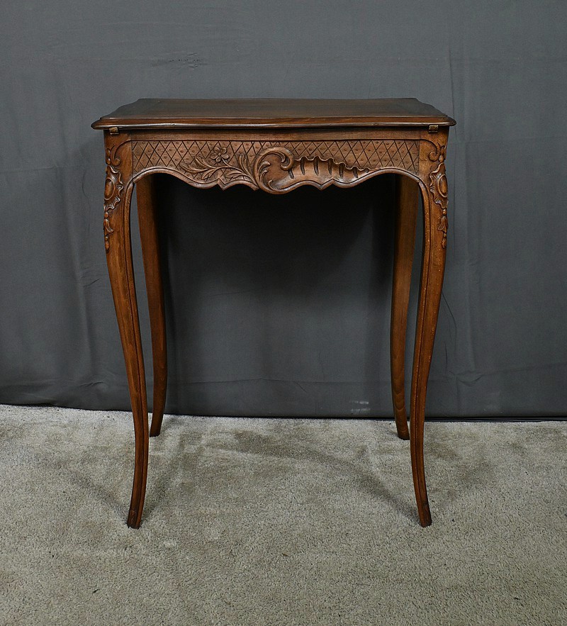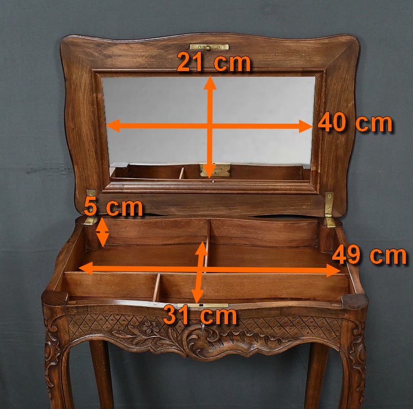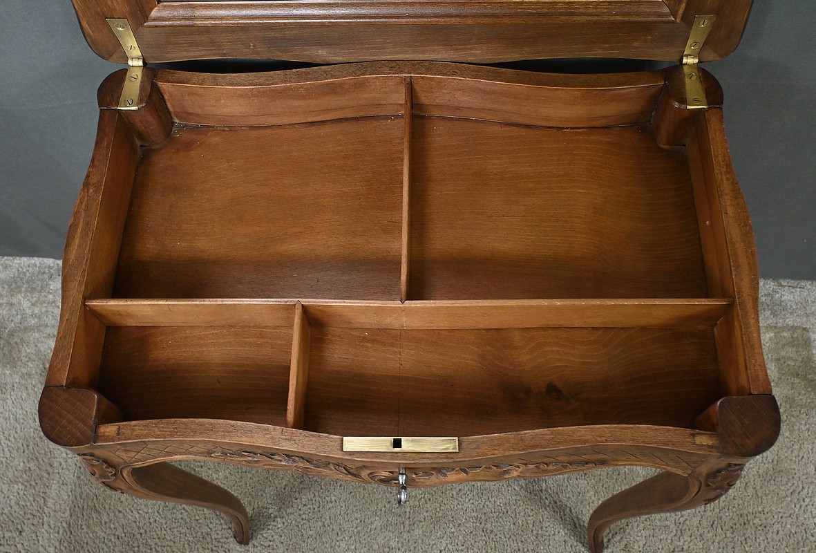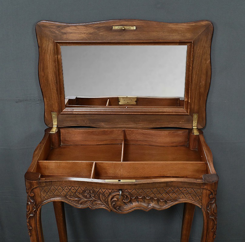 Cette charmante travailleuse en hêtre massif illustre à merveille le raffinement du style Louis XV, revisité au début du XXe siècle avec une élégance intemporelle. Son dessus à cadre mouvementé se révèle être un abattant habillé d’un grand miroir en partie intérieure. Il révèle un espace de rangement compartimenté, idéal pour organiser petits objets ou accessoires précieux. Une serrure fonctionnelle et sa clé permettent la fermeture de l’abattant. La ceinture de cette travailleuse est mouvementée, moulurée et richement sculptée d’ornementations : des fleurs, des coquilles et des feuillages en relief. Cette petite table repose sur des pieds cambrés, gracieux et finement sculptés, qui lui confèrent une légèreté visuelle et une prestance indéniable.