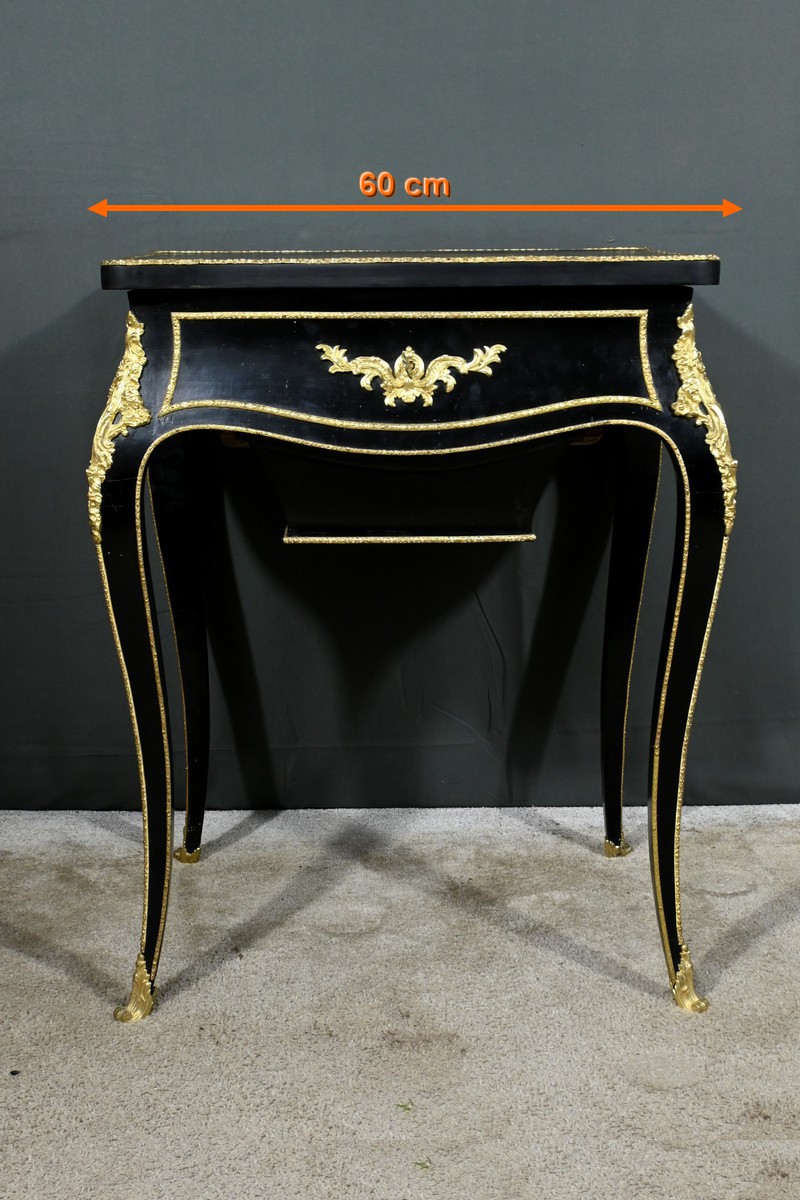 Cette élégante travailleuse en poirier noirci, datant du milieu du XIXe siècle, est un véritable chef-d’œuvre d’ébénisterie.