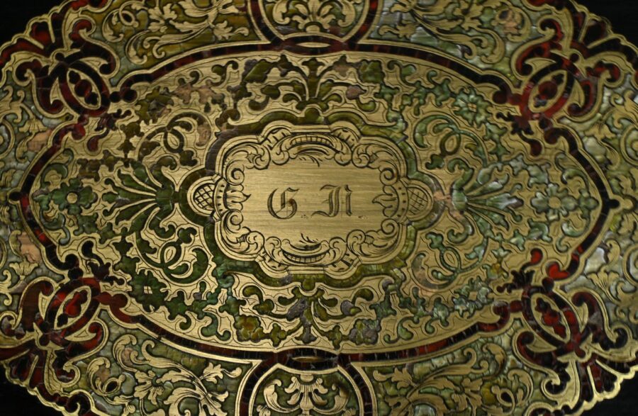 Le meuble s’ouvre par un abattant orné d’une composition en laiton ciselé, gravée des initiales “G A”.