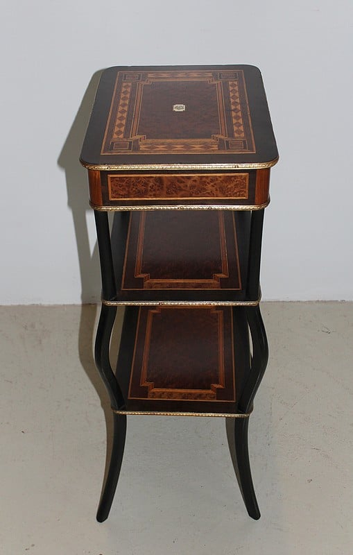 Travailleuse NAPOLÉON III en bois noirci et thuya ouvrant par un tiroir en ceinture. Son dessus est en placage de loupe de thuya entouré d’une marqueterie à dessins géométriques en bois clairs divers. Au centre, des initiales ‘CM’ entrelacées sur fond de nacre.
