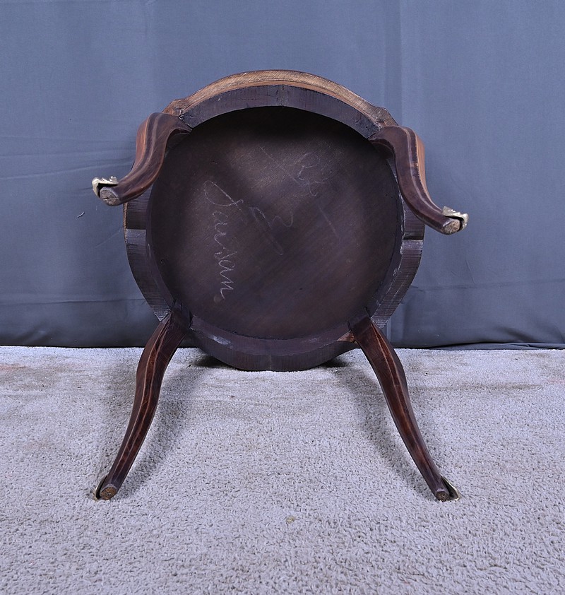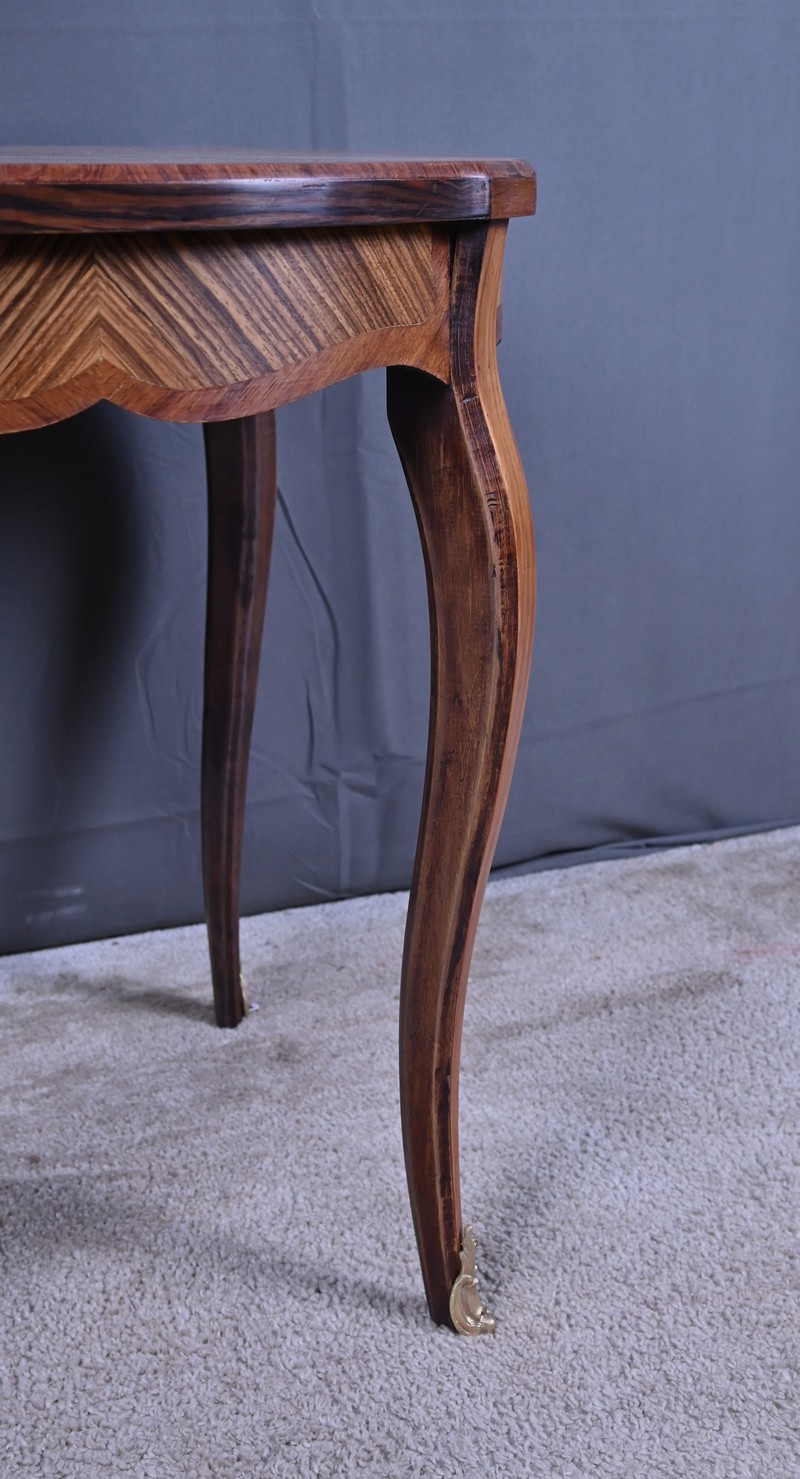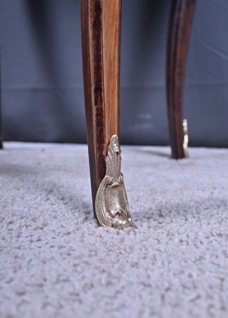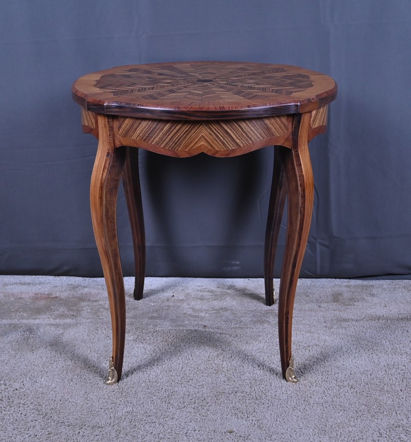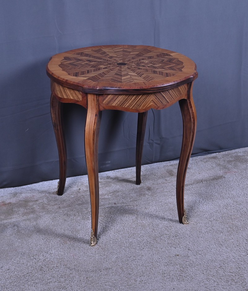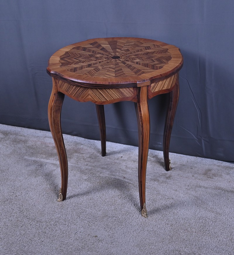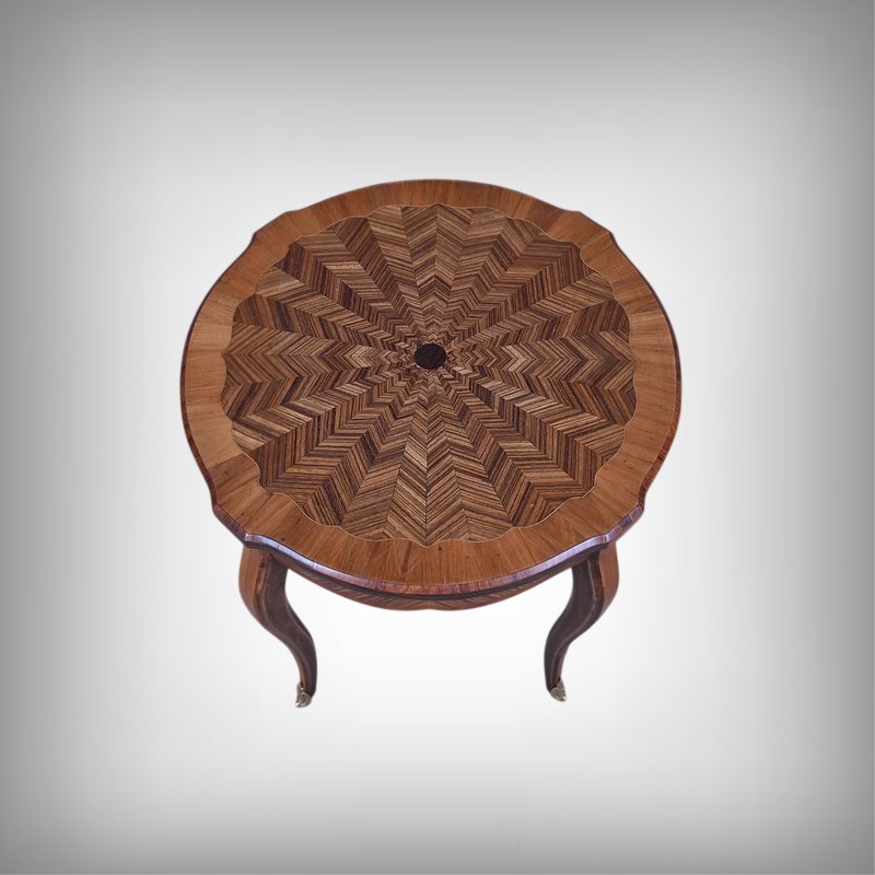 Cette table de salon de style Louis XV incarne l’élégance et la virtuosité décorative du XVIIIe siècle, revisité avec finesse. Son plateau mouvementé présente une marqueterie associant avec virtuosité le bois de rose et le palissandre pour créer un motif rayonnant d’une grande précision géométrique. Le décor en étoile, composé de chevrons parfaitement symétriques, évoque une rosace solaire dont le centre sombre agit comme un point focal. Chaque segment alterne les tonalités chaudes et veinées du bois de rose, accentuant l’effet de profondeur et de mouvement. Le contour chantourné du plateau, souligné par une moulure délicate, renforce le caractère précieux de l’ensemble. La ceinture arbore un placage en chevrons qui prolonge subtilement le décor du dessus. Les quatre pieds galbés, terminés par des sabots en bronze doré, confèrent à l’ensemble une silhouette légère et gracieuse, fidèle à l’esprit du mobilier de salon du XVIIIe siècle, conçu pour séduire autant que pour servir.